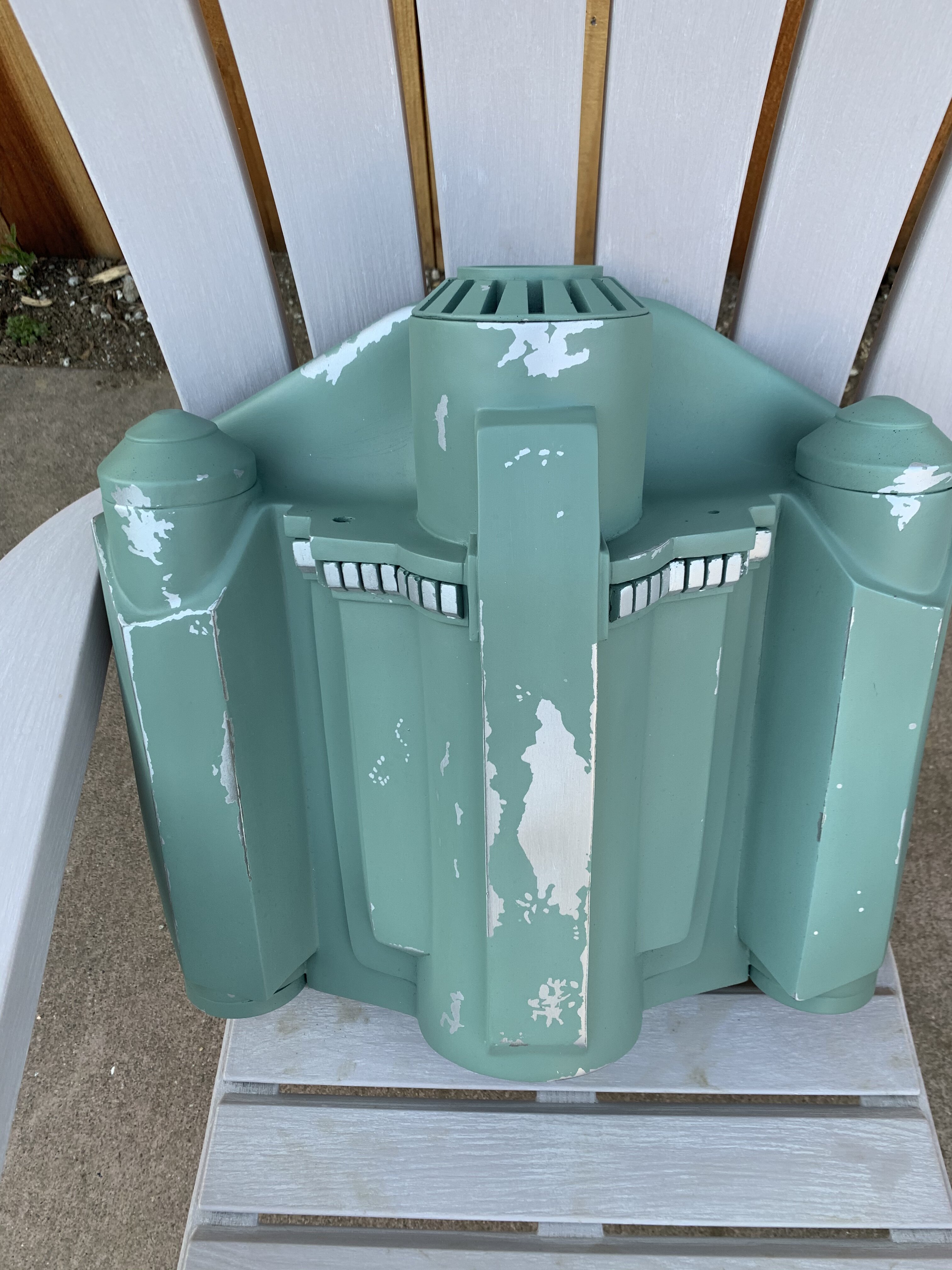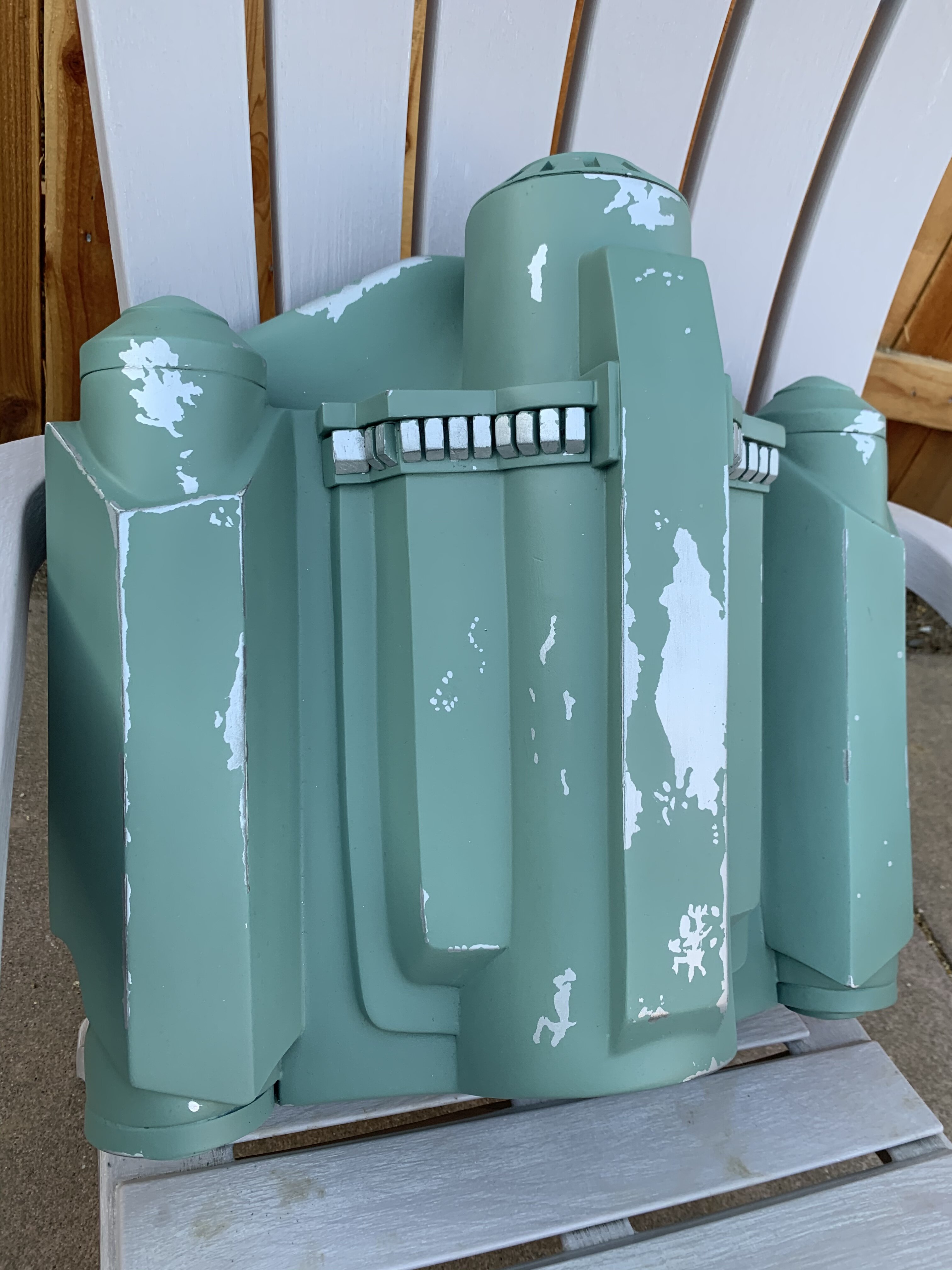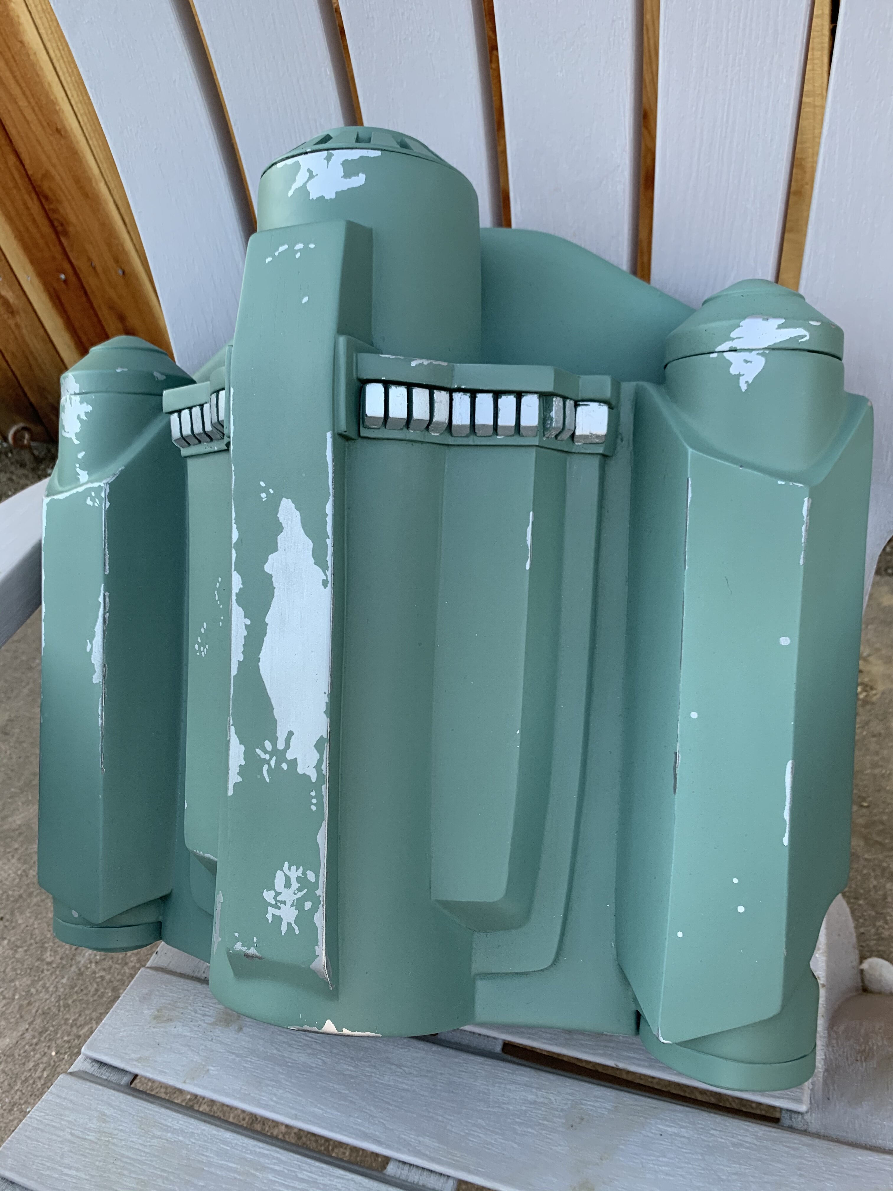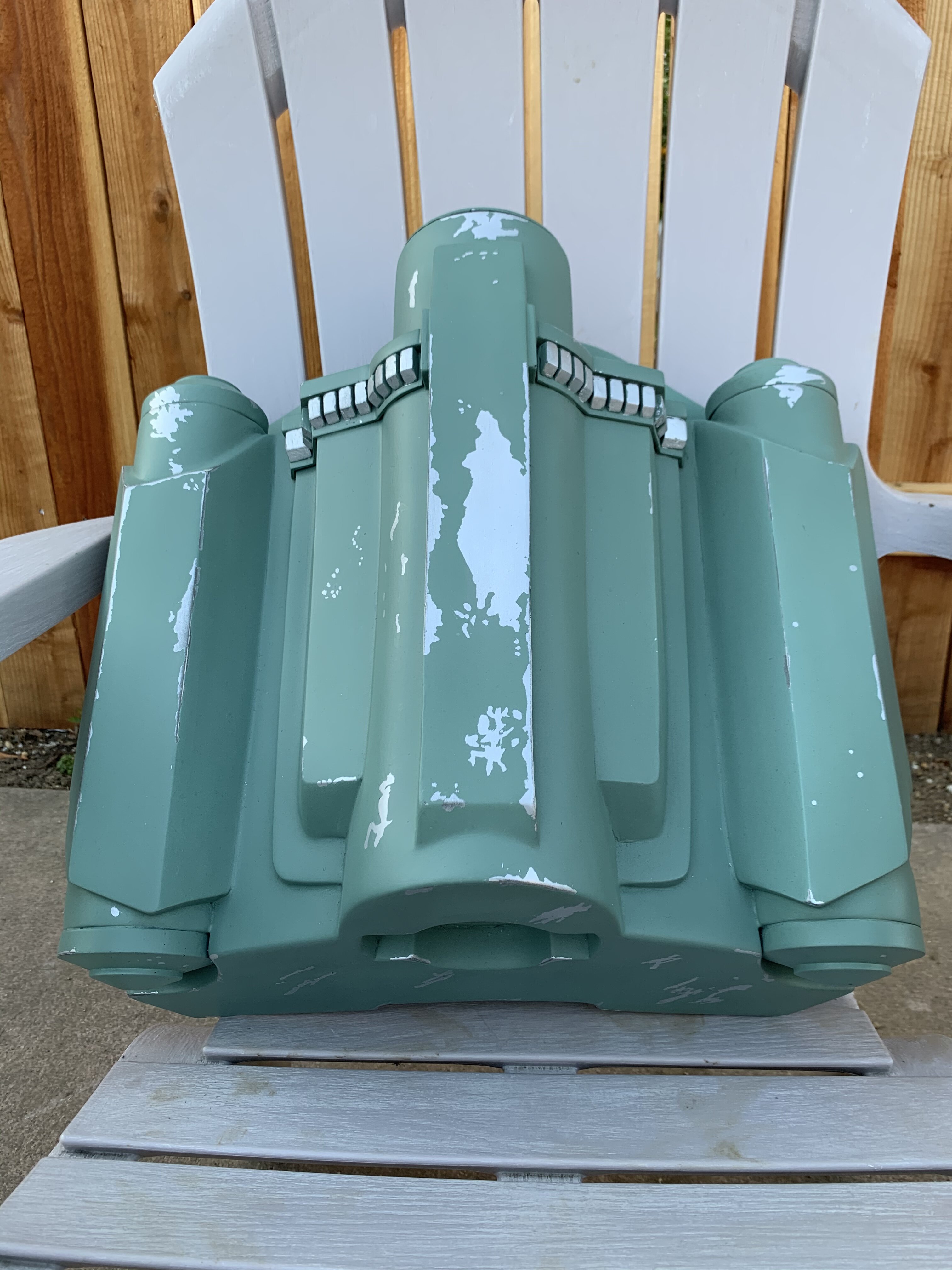 Alright! I finally decided to force myself to use the airbrush I bought over a year and a half ago. Honestly, I was intimated to use it, but I’m stoked I did today. Mixed my own paint color and couldn’t be happier with the new base color on my jetpack! 2 cans of Model Master Panzer Olivegrun and 2 cans of Model Master Lichtblau RLM 76 at a 50/50 mix with about 10 drops of Humbrol White in it. Looks right where I want it to before weathering compared to the cheeks and dome on my helmet.