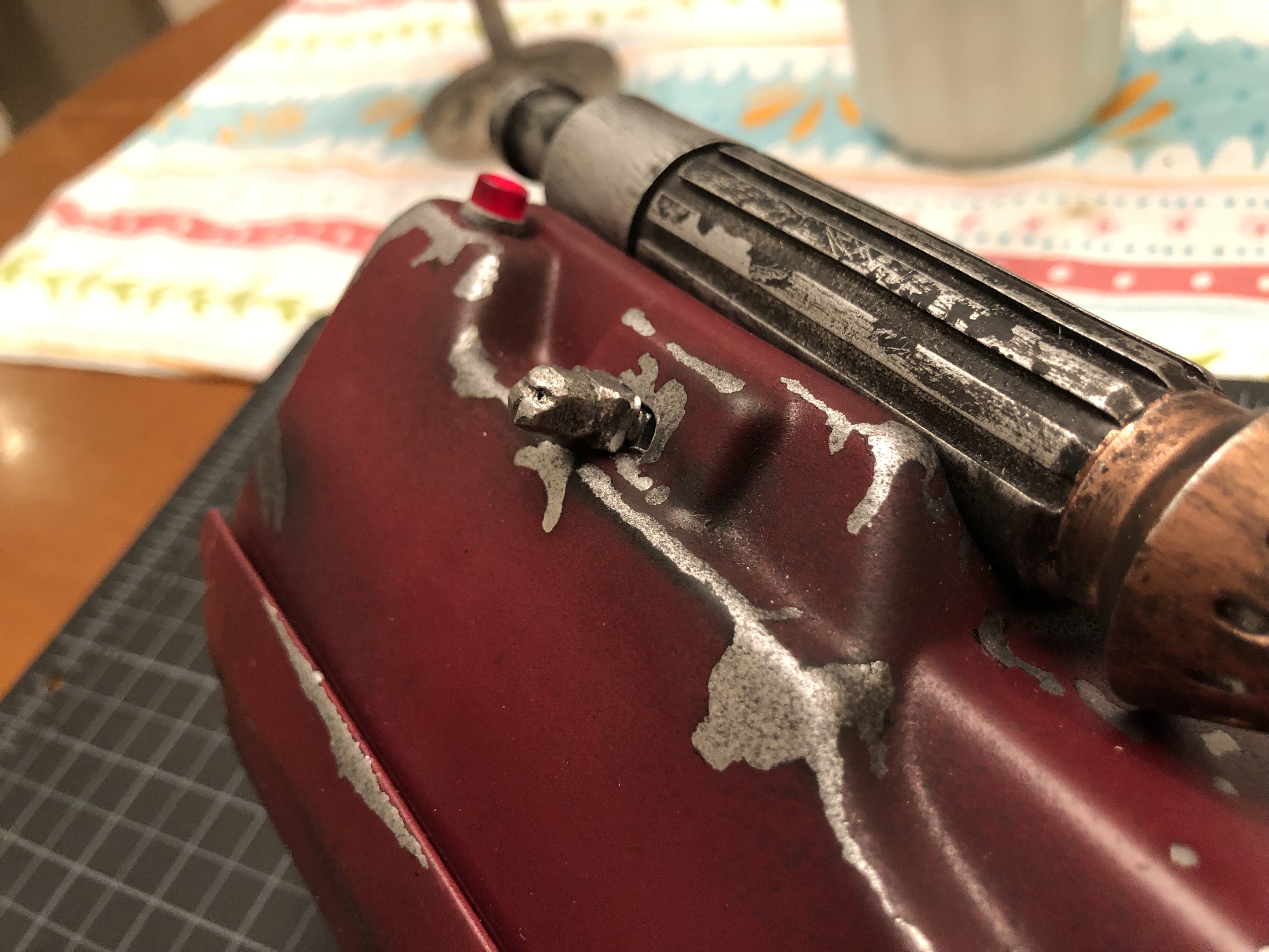 First I hit everything with black (after masking), then about 2-3 coats of Rustoleum Claret Wine. Peeled back the masking, and hit everything with 0000 steel wool to knock it down! Tonight, I topically painted “the hump” on the right gauntlet, as well as the area above the gauntlet darts (this is grey, not metallic).