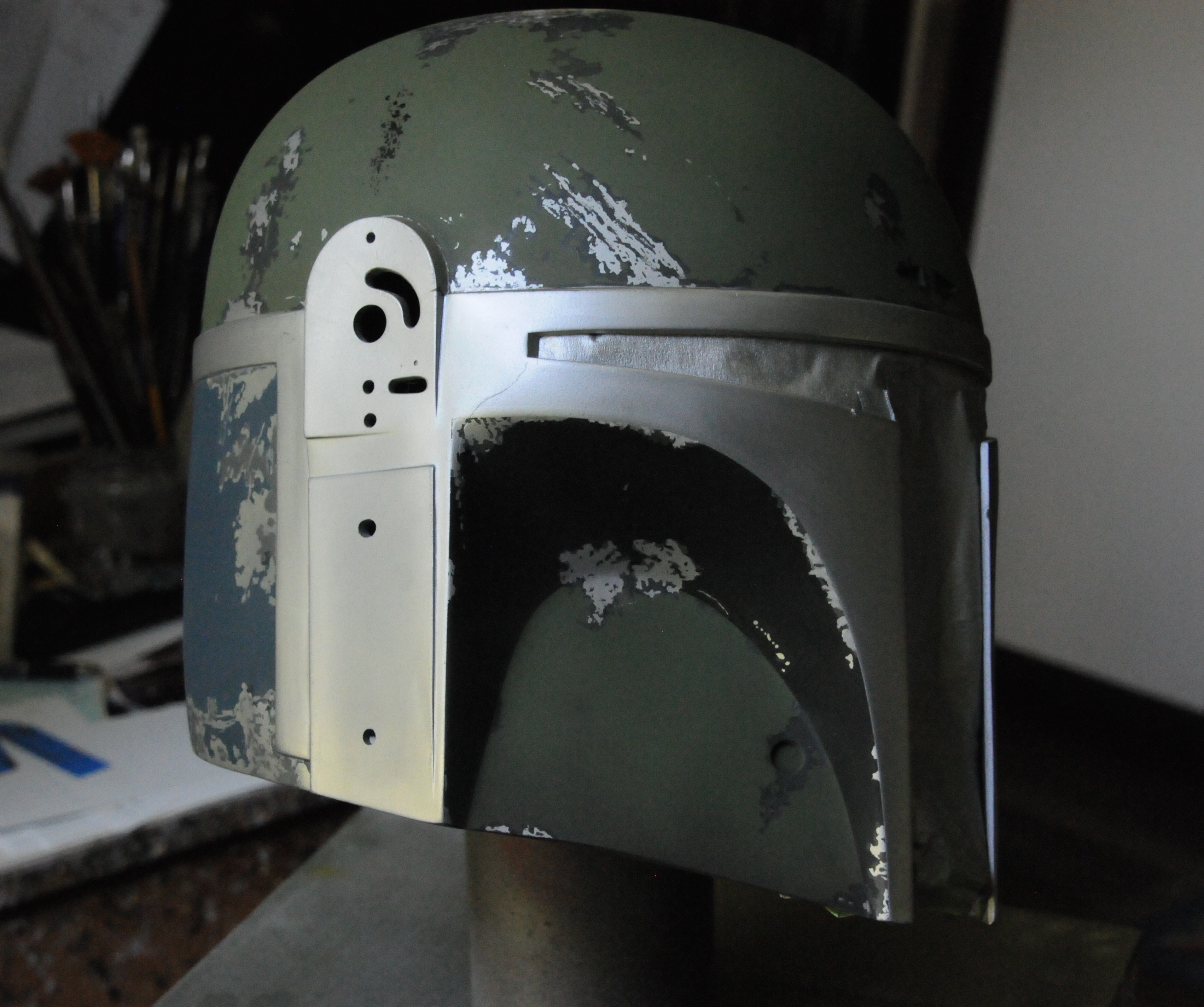 This helmet is painted about 90% layered and 10% topical. I'm including light wash as well as opaque as topical. The base after priming is Testors Non-Buf Aluminum. The rest is Humbrol enamel.