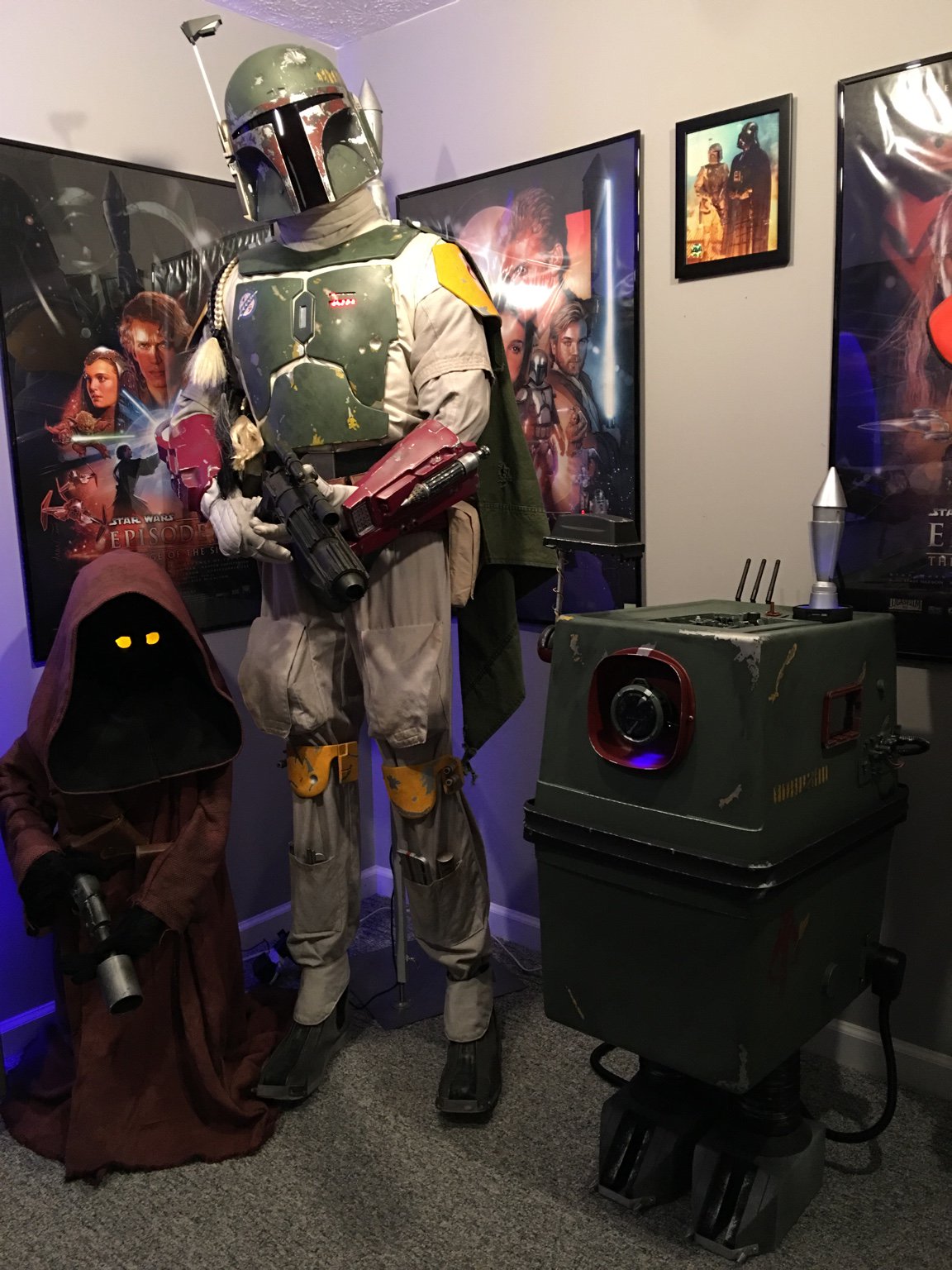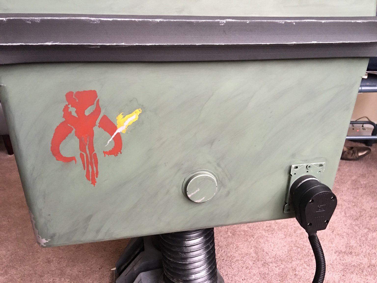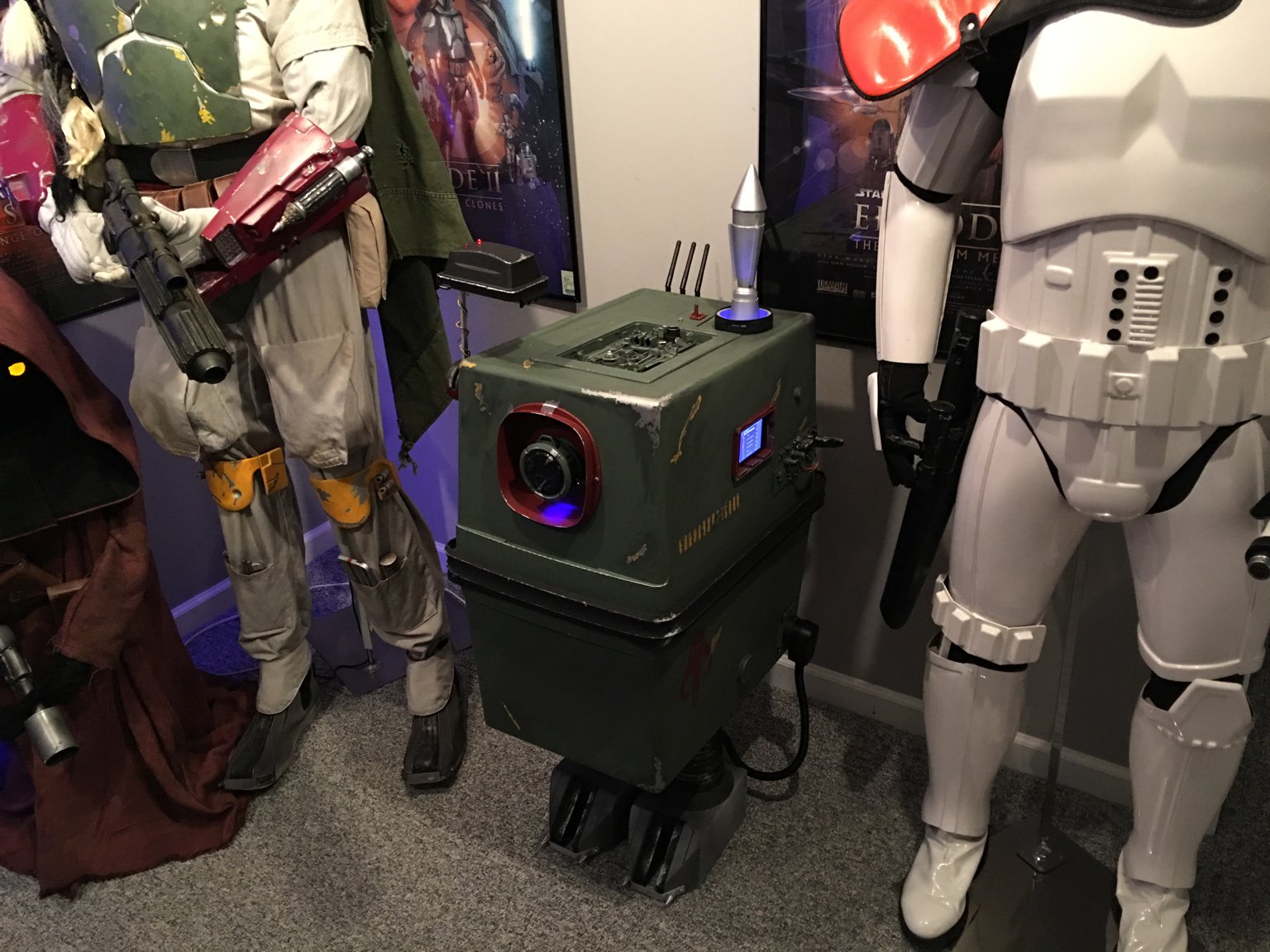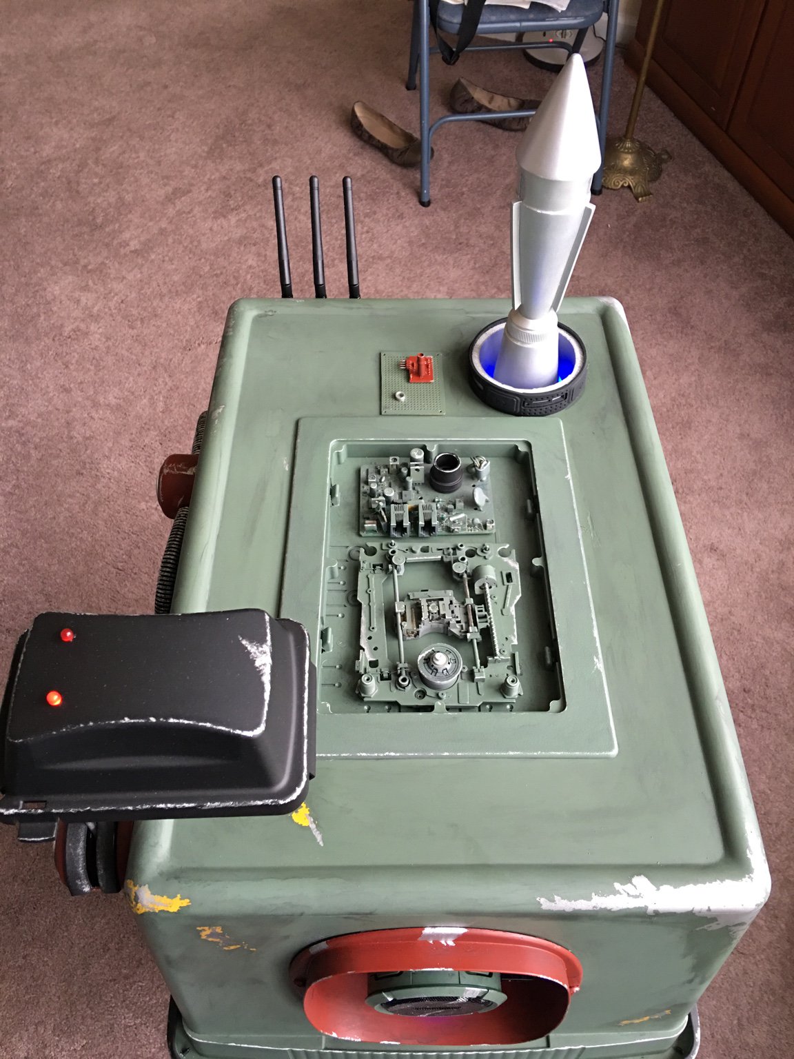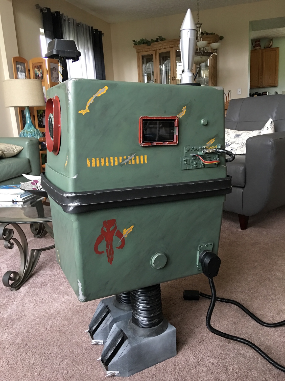 This baby has all the fixings! He has a rocket launcher with an LED system that Fett can use for an airstrike, rangefinder, active USB ports for charging your stuff, an integrated iPhone for playing music/videos/Gonk sounds, an eye that doubles as a Bluetooth speaker, and he's hinged at the back to store stuff! He's painted in a traditional Fett paint scheme complete with kill stripes, Boba style feet complete with spikes, hand painted Mythosaur, and battle damage over a Tamiya Field Gray TS-78 color base. All of his electronics and LEDs are powered by a USB Hub running on 5 volts that I spliced into a mongo 220 oven plug; clunky but not gonna burn the house down. He's a power droid with a purpose! (And did I mention that he has a cool rocket?!?!? lol)