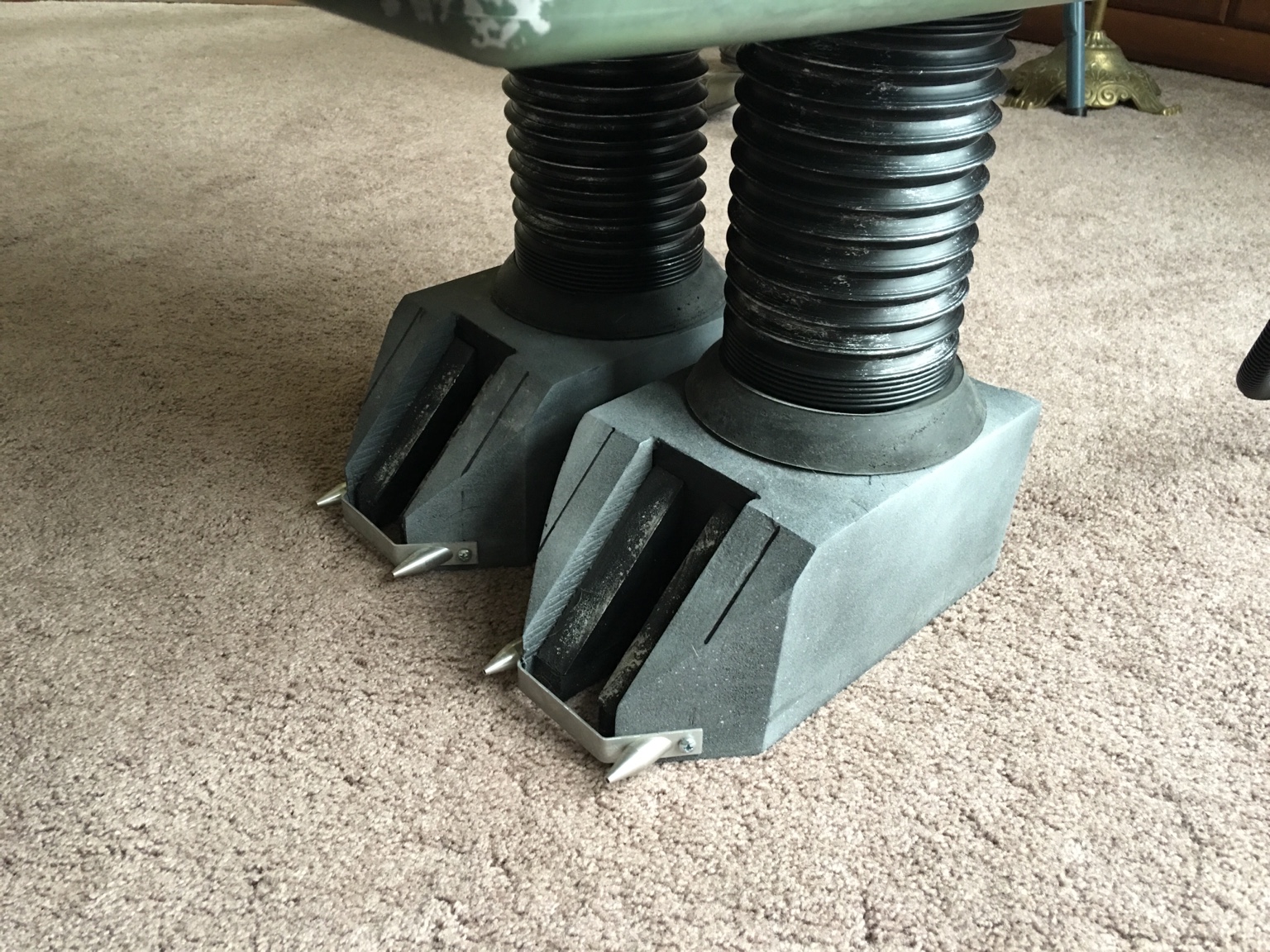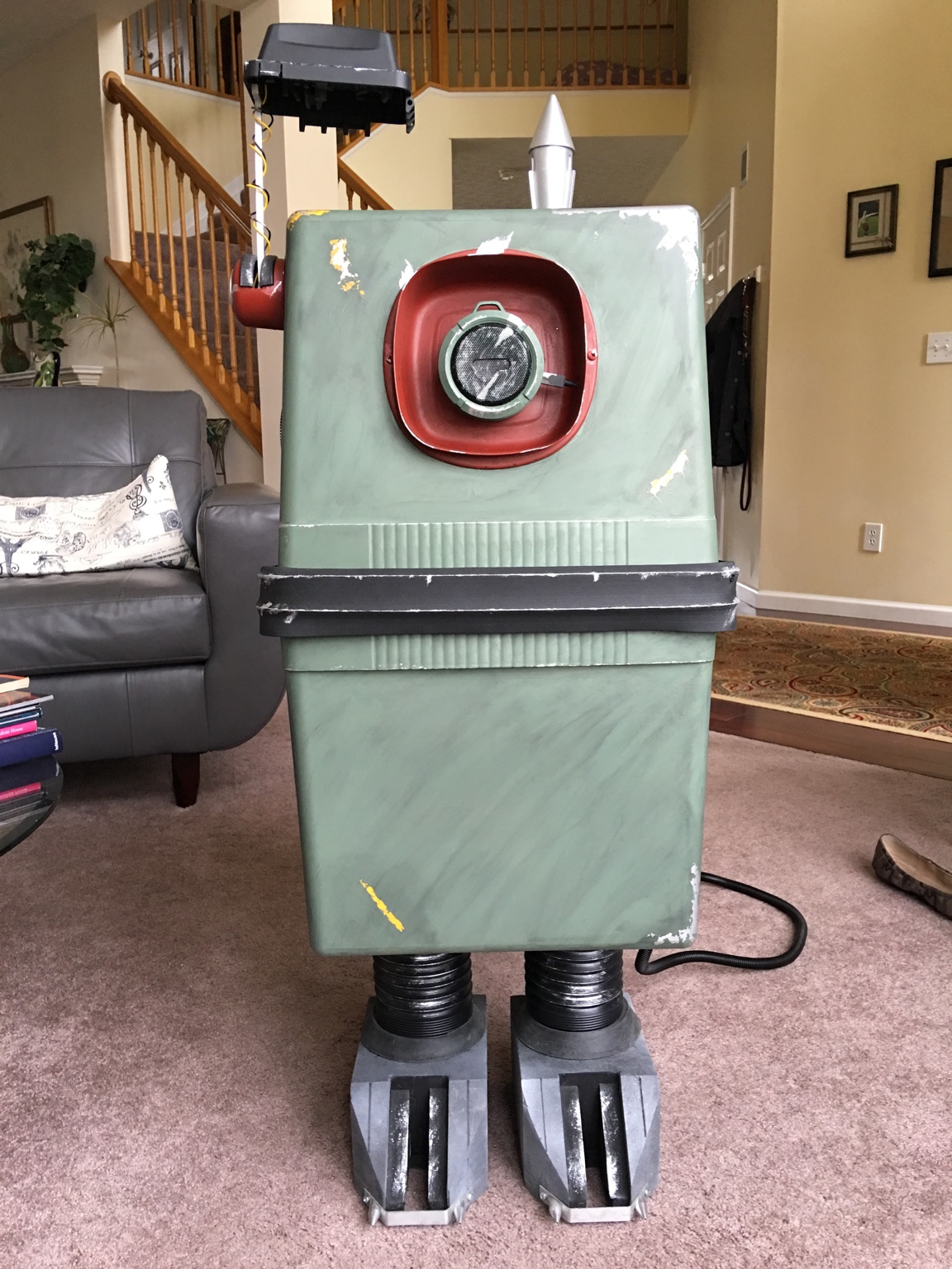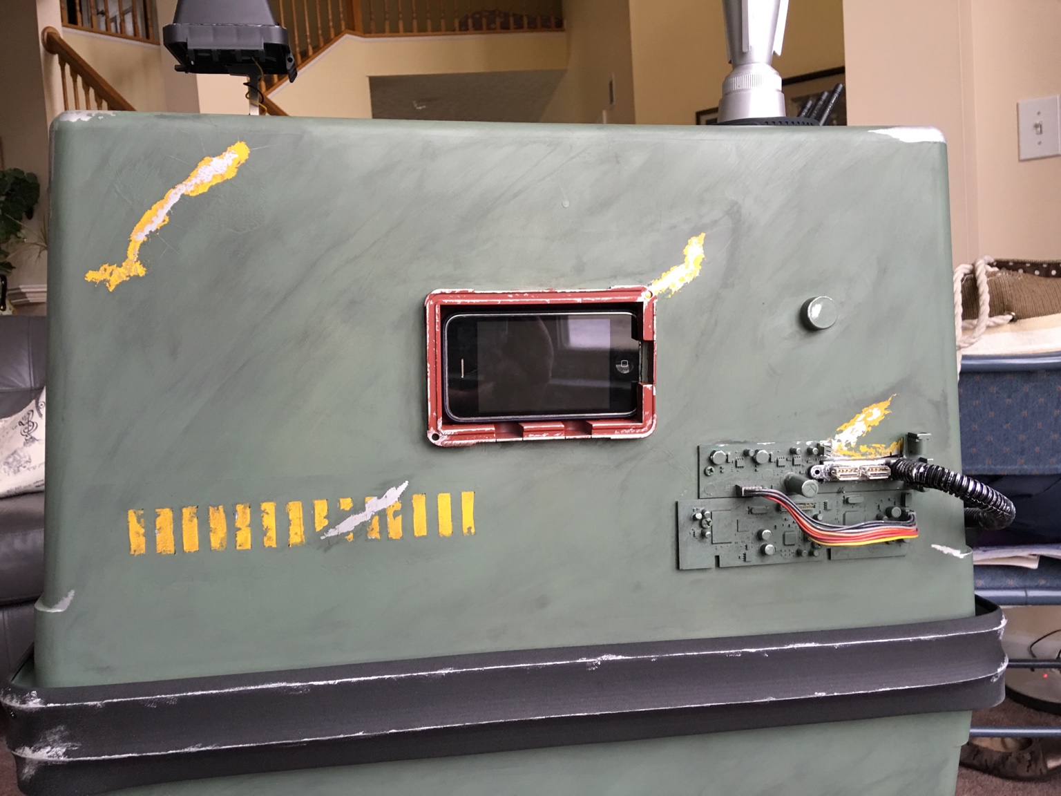His greeblies came from an old phone line RCA modem hopper from 1998, an Xbox 360 HD DVD drive, and various tupperware I stole from my wife. The iPhone is an old 3G that I had in a drawer with a speaker I grabbed on Amazon. His belt is a neoprene garage door gasket and the hinge system is a basic cabinet hinge fashioned to a PVC board support system. I used a 3' toilet bowl gasket on his ankles to cover the bondo work I did to seal the top of his feet. The silver caps on the small pods are from Starbucks K Cups. It's a secondary filter I stumbled across when I took one apart for kicks. The range finder and the red recessed iPhone pod are an outdoor electrical gang box (the rangefinder is the lid and the pod is the frame). His antenna system is an old Wi-Fi card.