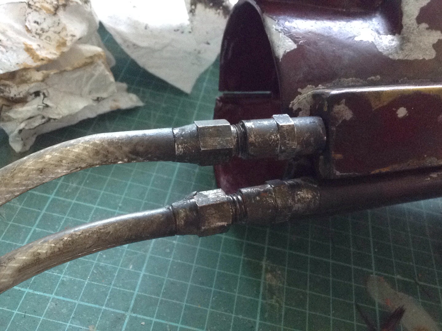 I used enamel paints as they stick better to the hose. Paint goes on, using either a paint brush or toothbrush. I let it sit for a few minutes and then useing paper towel dab it off, leaving behind a thin film of paint. I then repeat this process with various earth colours over and over slowly building up the grime look till I’m happy.