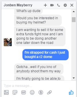 Oh thank god you sent my helmet back. I thought I was surely going to be burned for $800 instead of $600. I just wish I knew what I know now about you 3 months ago When you promised to paint my armor and buy and paint a helmet for me in exchange for me building you a set of armor. I was a bit worried when you realized the armor was too big for you when I repeatedly told you the size you chose was way to big and you kinda held on to two pieces of my armor in exchange for me to make you a new set. I was able to paint my own armor at the time and it did come out well. So after talking to you a bit and me buying my own blank helm I decided to make the second set of armor in exchange for you to paint my helm so after a few weeks and you painting Stryykers metal armor he managed to get out of me for free (that's a whole other burn story) and you offering to sell me your old helmet I decided to call it a loss and ask you for my helmet back witch you sent me (Thanks for that.)