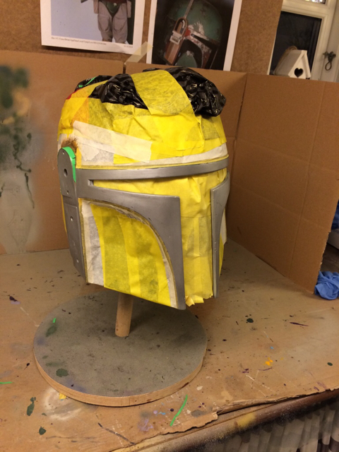 Since I have acquired my all time favorite Boba helmet sculpt, a MSH2, I've decided to post one last paint up thread. The base colors have been applied using the colors off of my 'airbrushed challenged' list including the new Valspar brand updates. The killstripes are Valspar Gloss Mustard Seed and the visor, mandible, keyslot areas are the Valspar Merlot. I've also just started painting the damage and spent the better part of yesterday and today working on the 'catscratch'.
