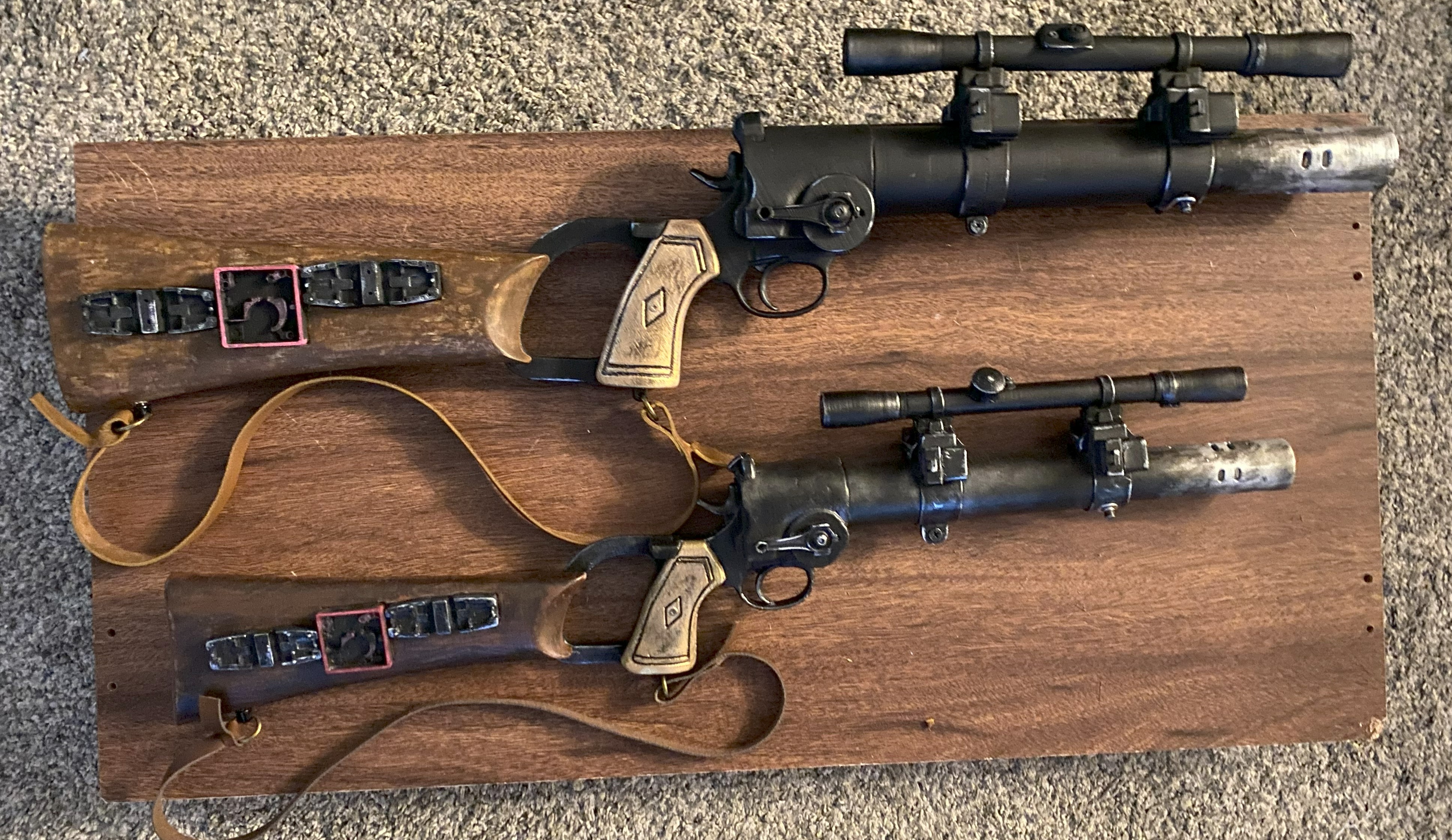I've been working on the rifle sling for my EE-3, and the lanyard rings. I knobs themselves are off Etsy. Rather than expend the effort to make them swivel, I just glued them in place. The rings are too small, as I've added a pair of split rings, which I intend to replace with some blackened steel ones. I used ConvergenceProps's tutorial. I still need to weather the strip of leather.