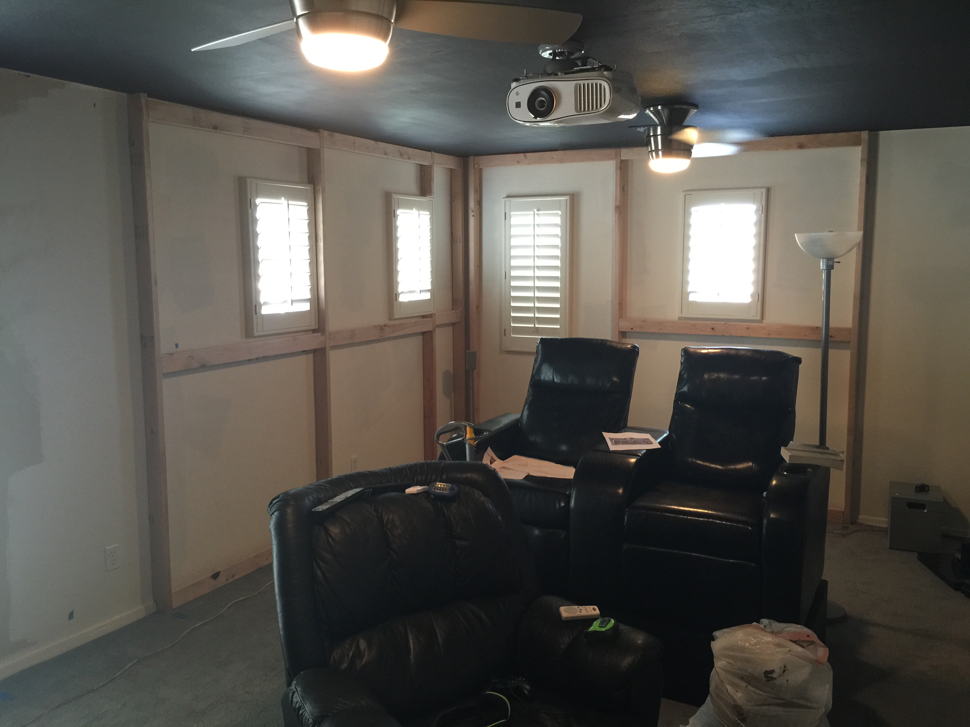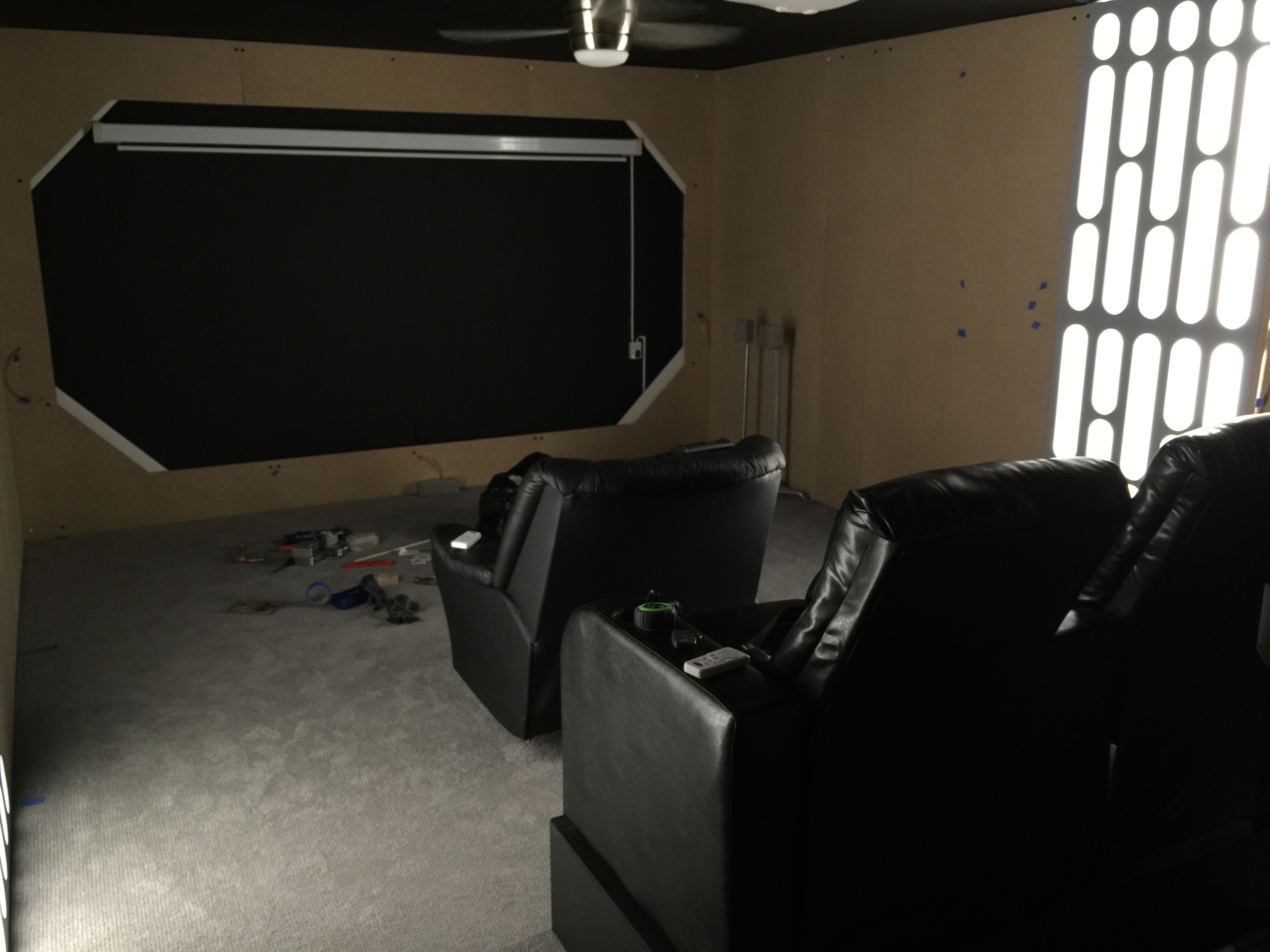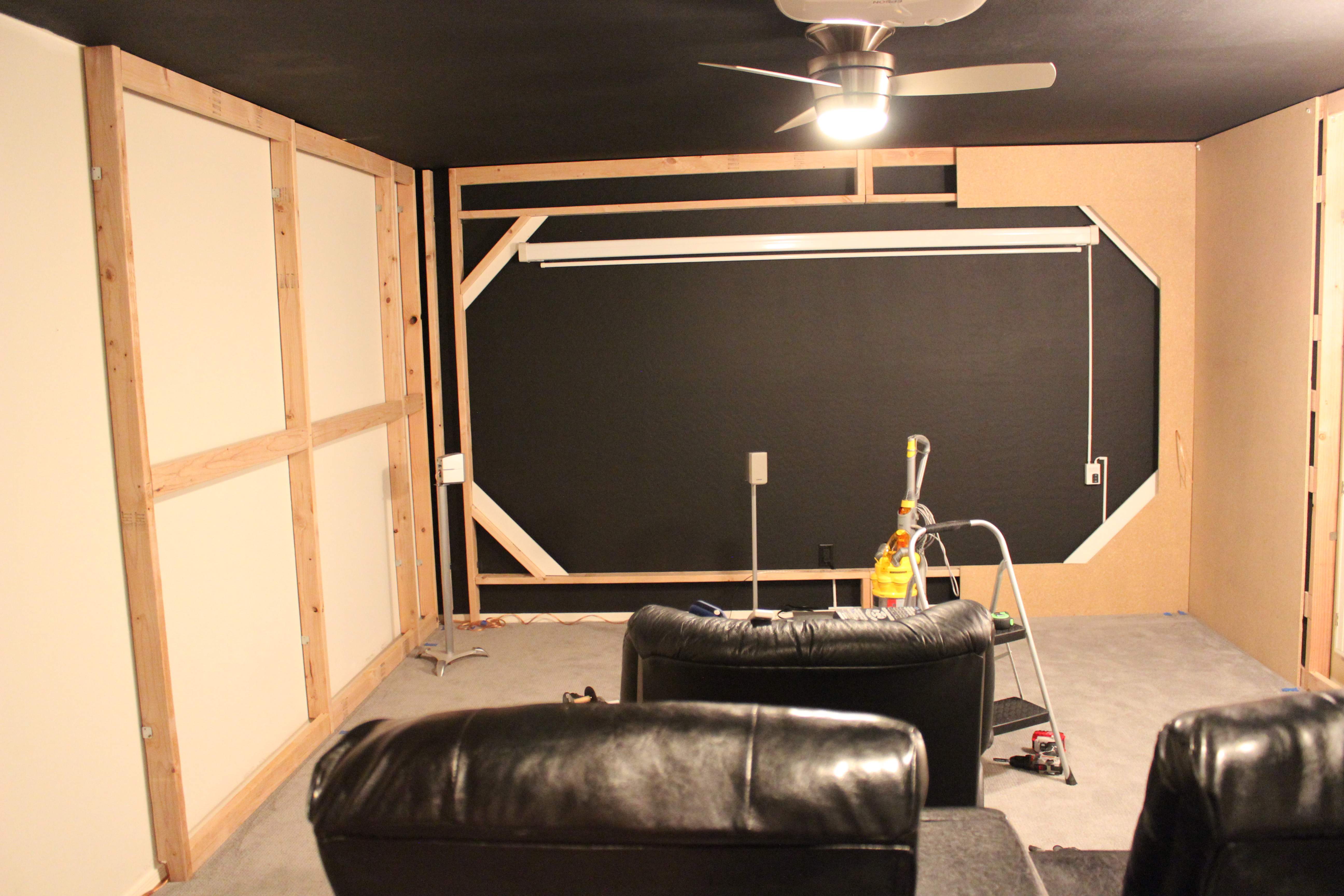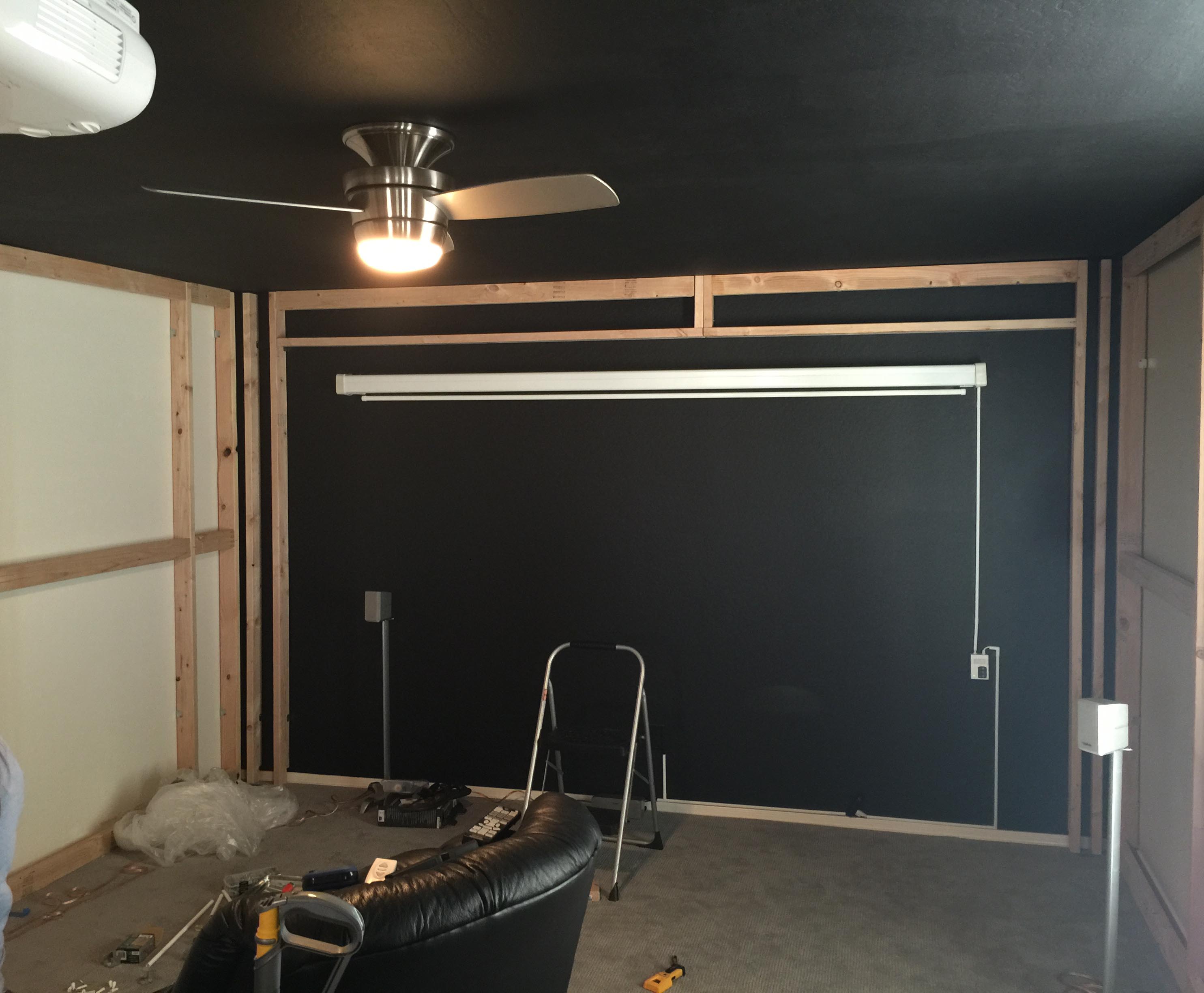 I painted the front wall and ceiling black, mounted the new fans, projector, and screen. I'm running an Epson Optoma 3500. I was skeptical about getting a projector, but I wanted something larger for the room and still wanted 3D. For the price, I am incredibly happy. There was a lot of great feedback on this projector. The screen is 120".