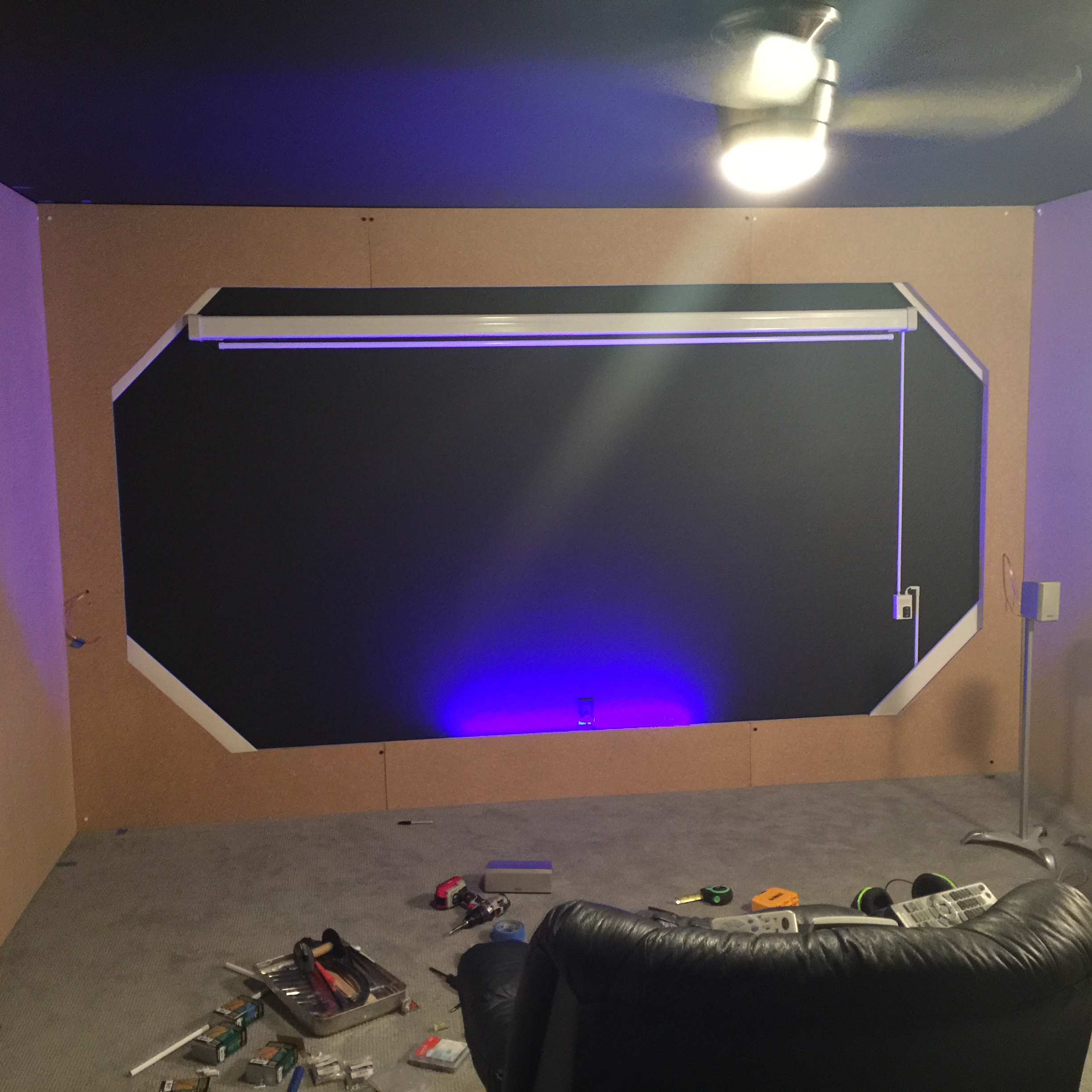 I'm going to paint the projector screen housing black along with the wire covers and control box. I also added a strip of blue LEDs that work off a remote.