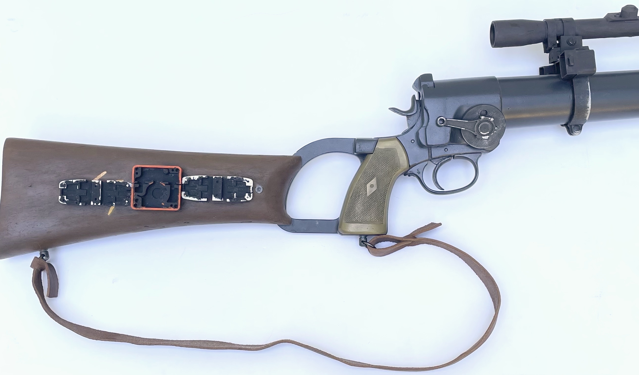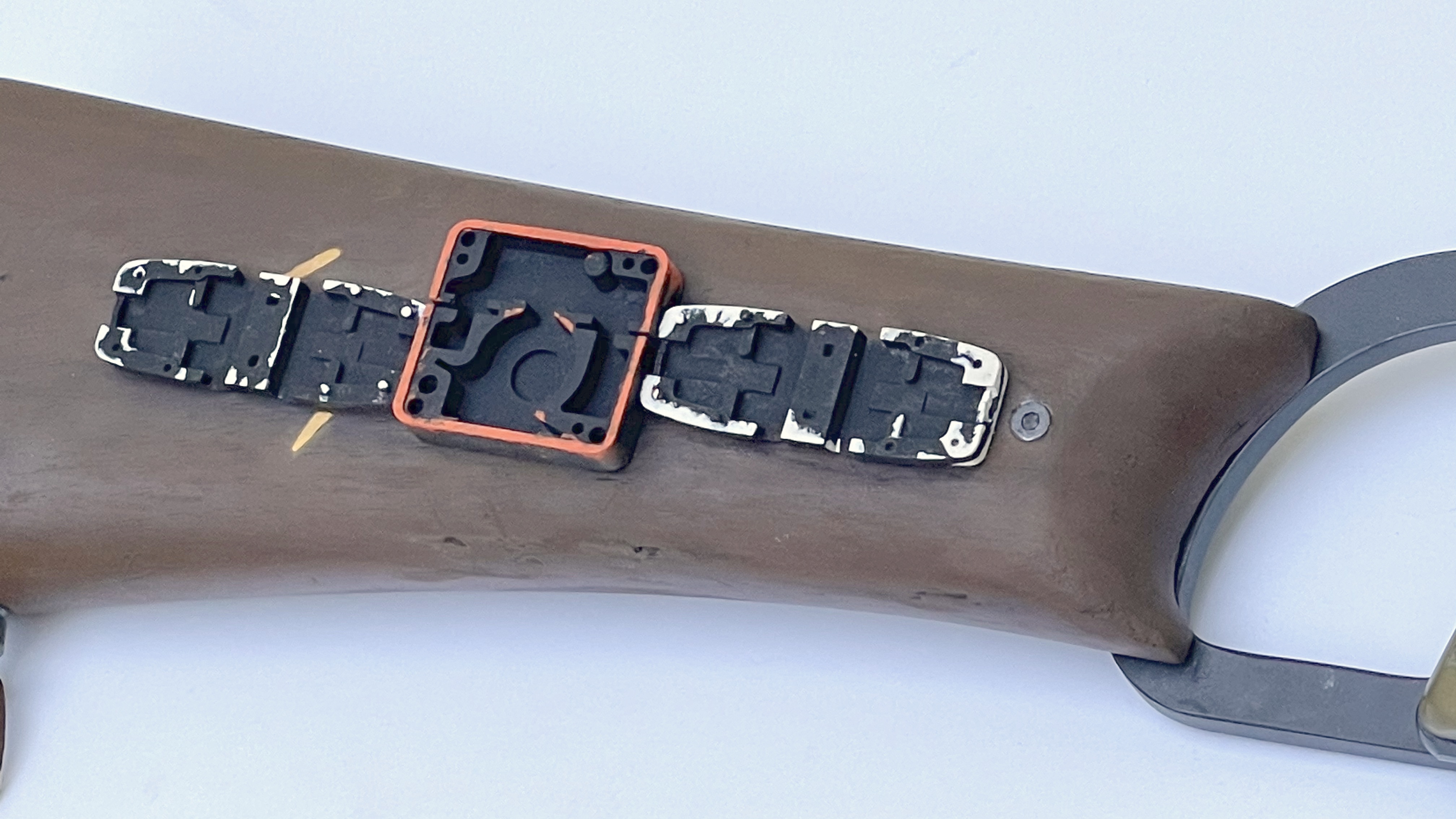 I reckon that's simply from how Jeremy held the rifle. He usually covered the right gauntlet over the stock which would obviously cause a bit of friction. Doesn't seem to be any Primer applied either, looks to be the same jet black paint used for the gauntlets and laser.