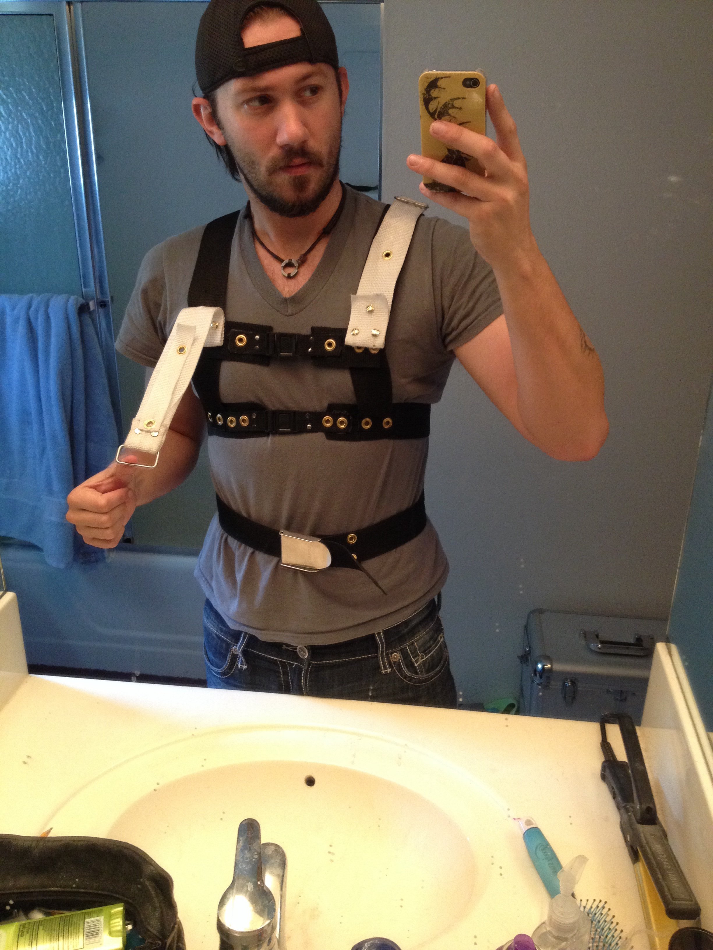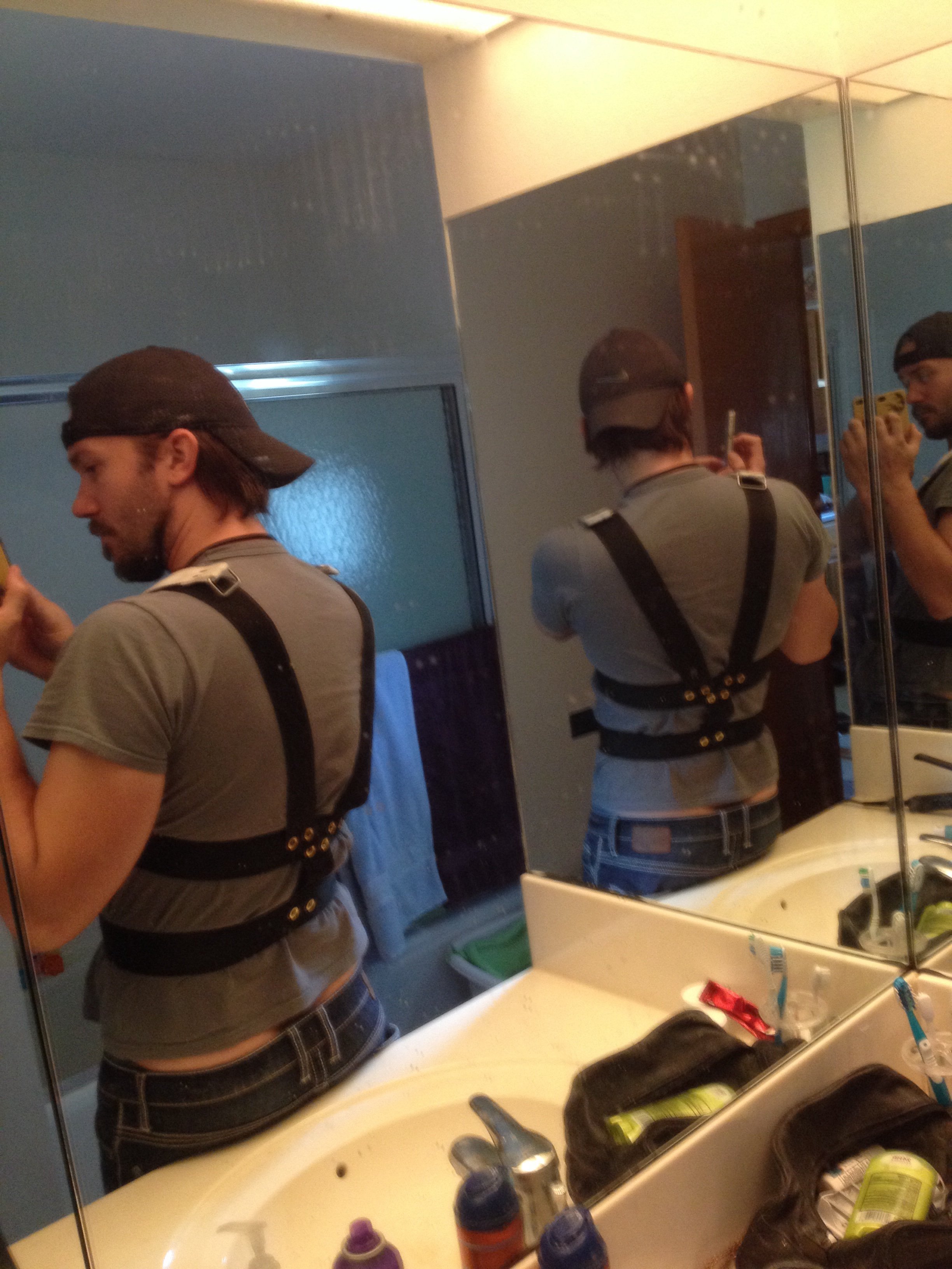 I just made a belt under mychest then put the straps that run over your shoulders and then connected it to another belt slightly higher my chest then I put a section that goes down the spine and that connects to the belt tht has the us divers buckle on it. The I attached the straps that connect to the jetpack