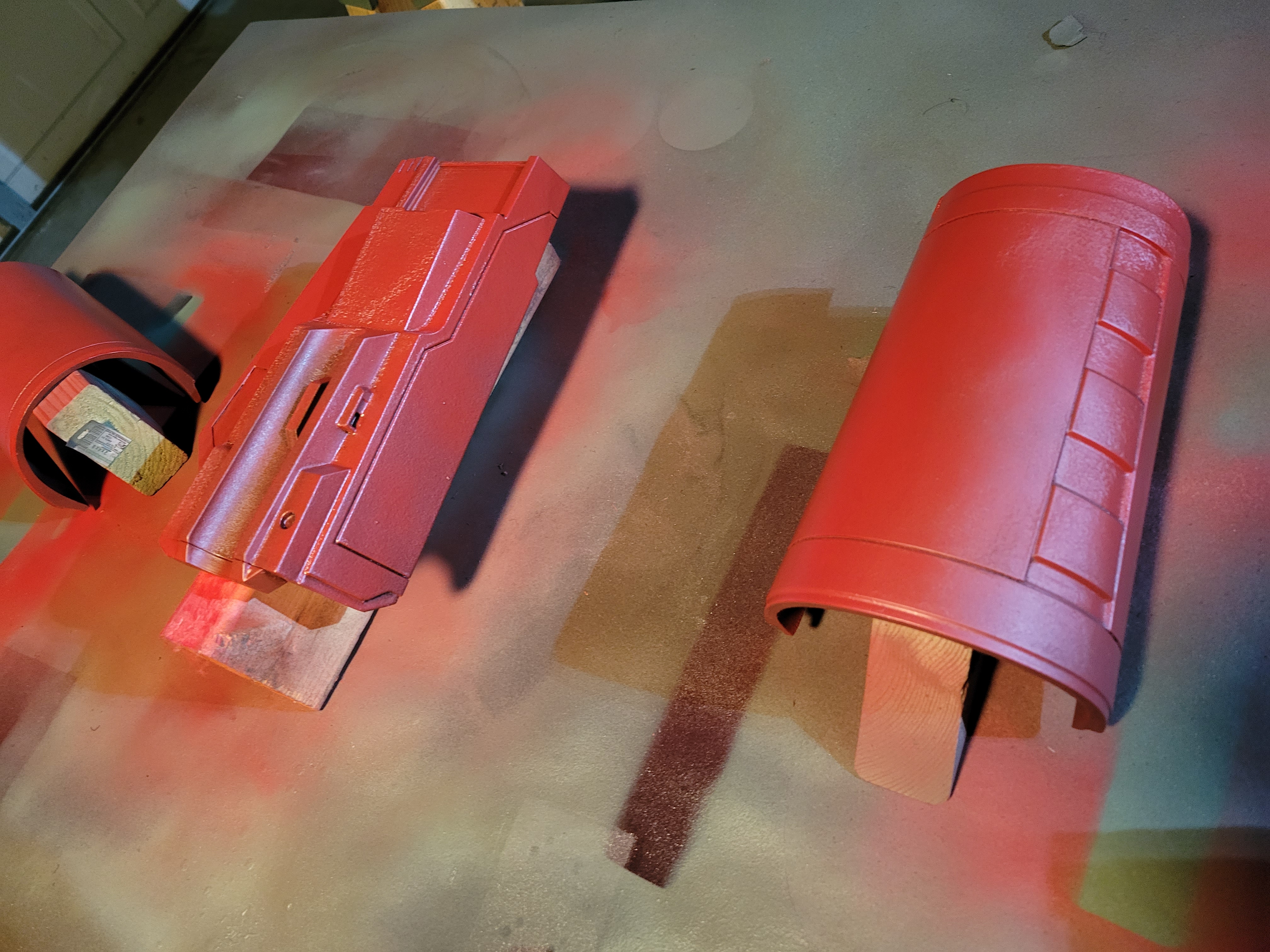 Obviously did some painting tonight. Did all the "metal" and also my collar studs. Gotta figure out how long the right sleeve pocket is for the double hoses so I can get that built and installed tomorrow.