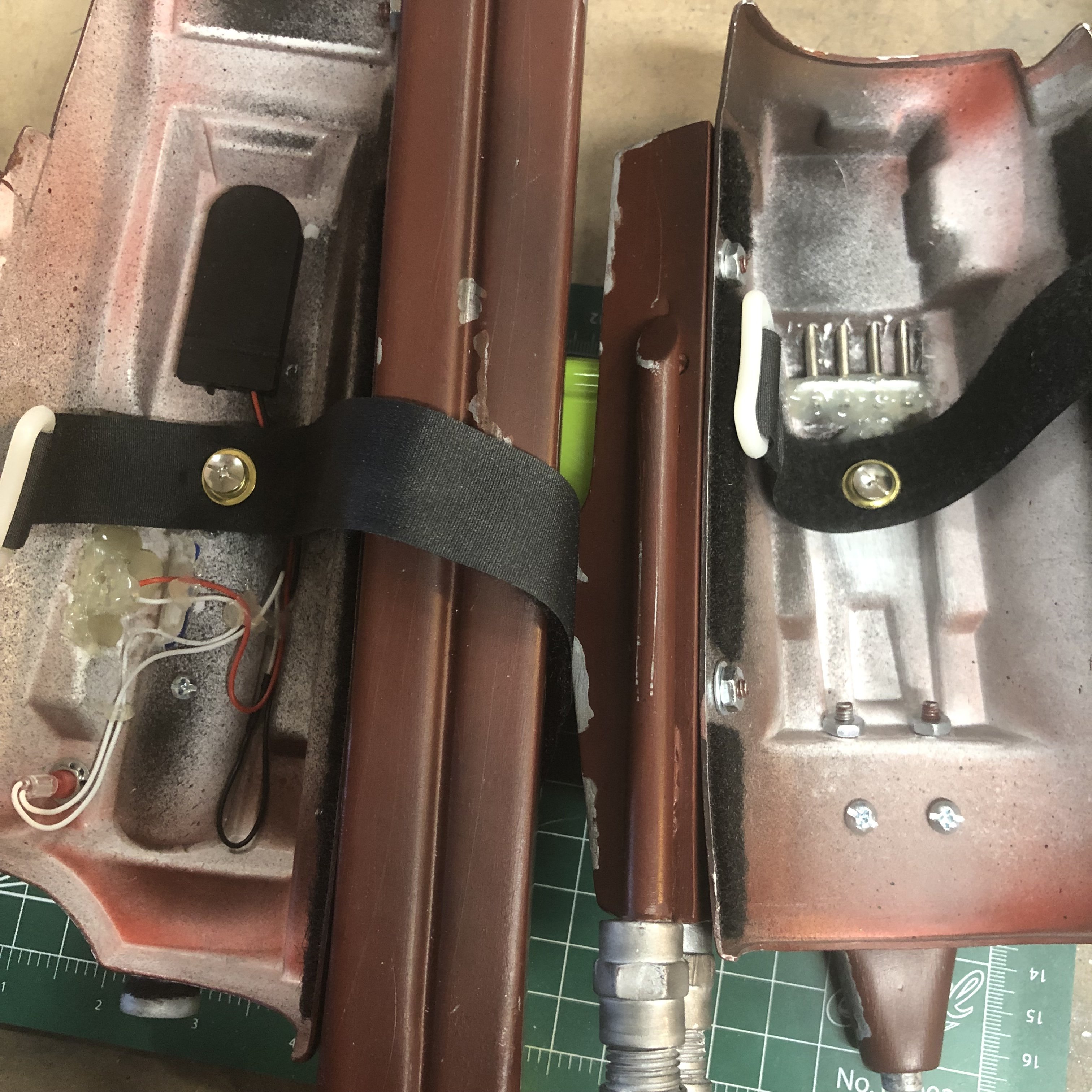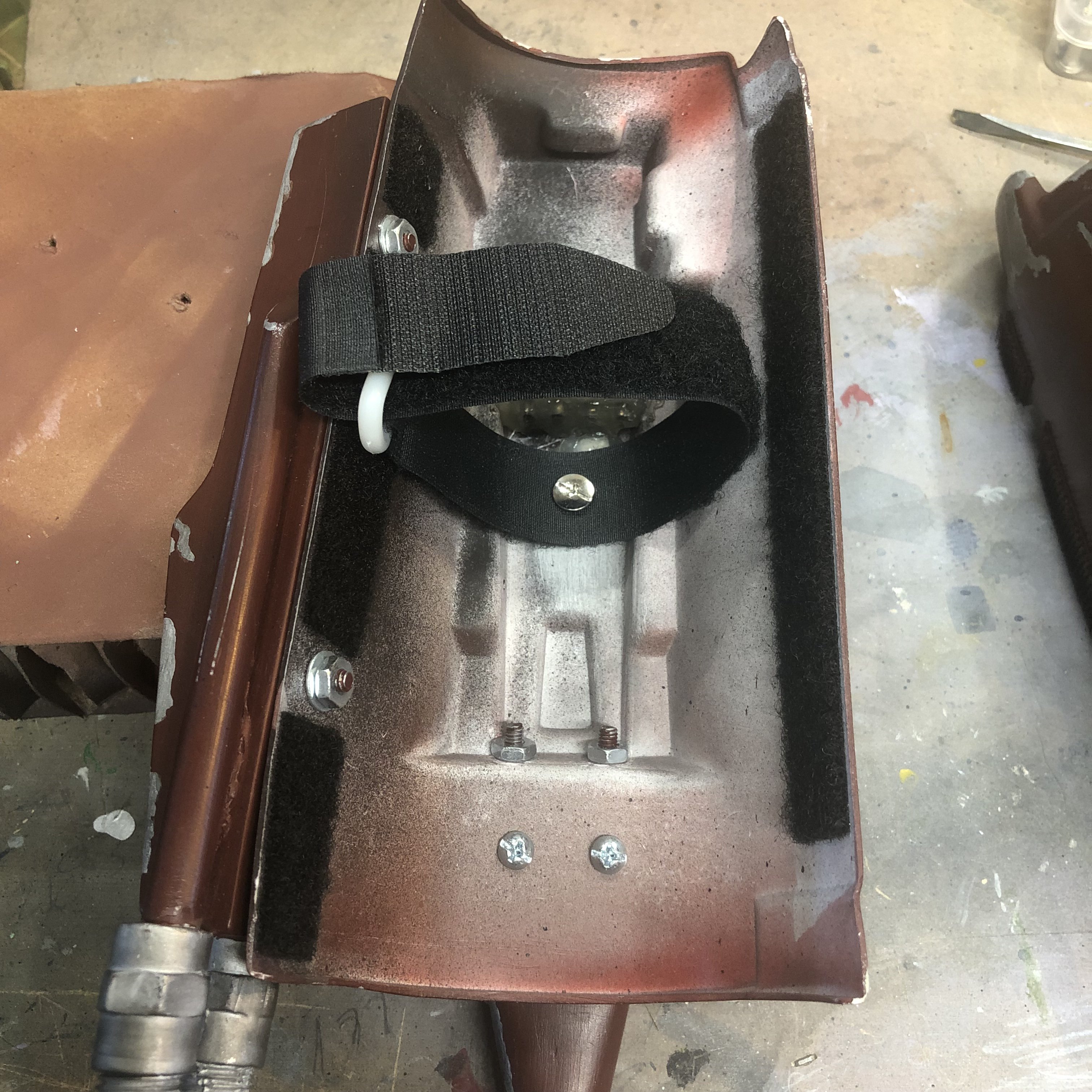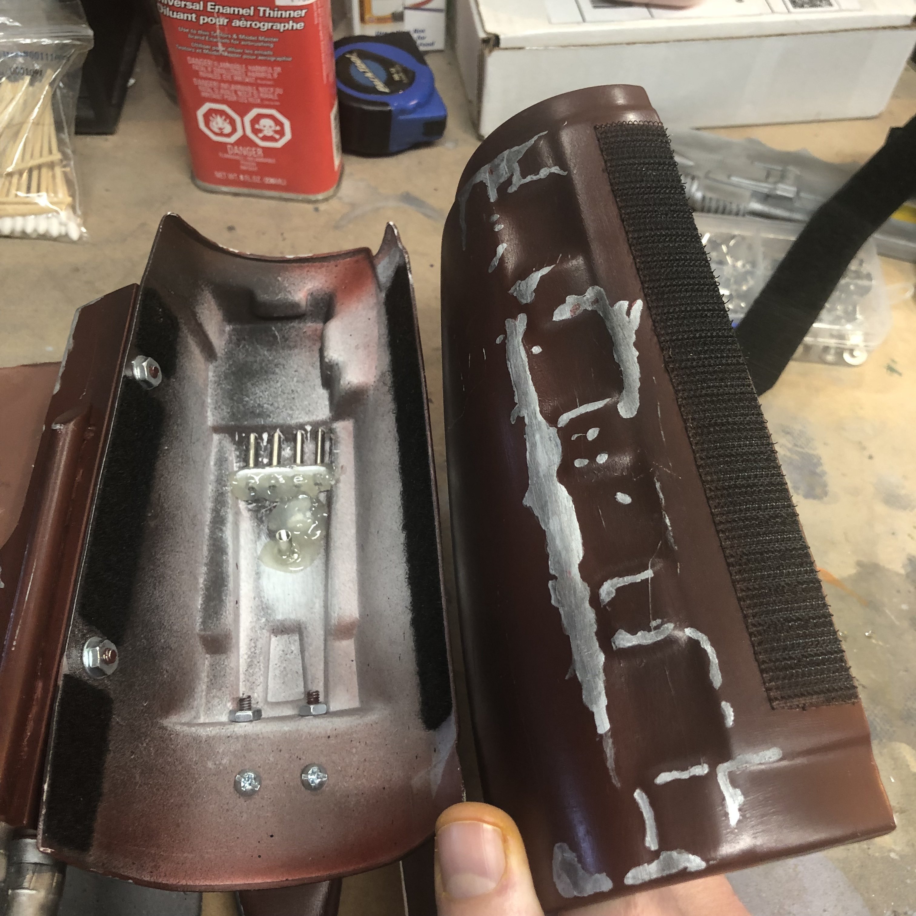 Here is the right gauntlet first then the left. So I epoxied and Chicago screws on the top half to hold the straps. I need to reinforce the hole in the strap because it will pull through.