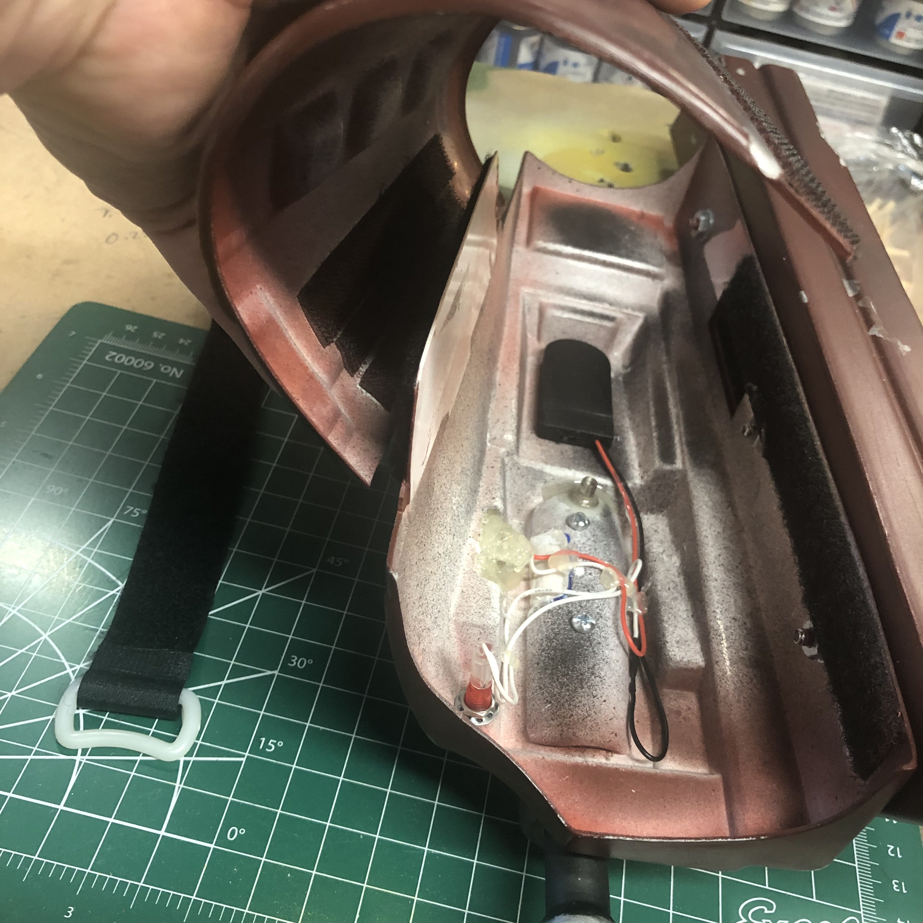 Got my hollow stalk installed from MachineCraftReplicas and JC27 range finder lights. And HenrysHelmetfans installed. No more foggy visor’s. Just need to get a servo for the stalk. Just Velcro and gaffers tape. Might adjust the fans when I get a servo.
