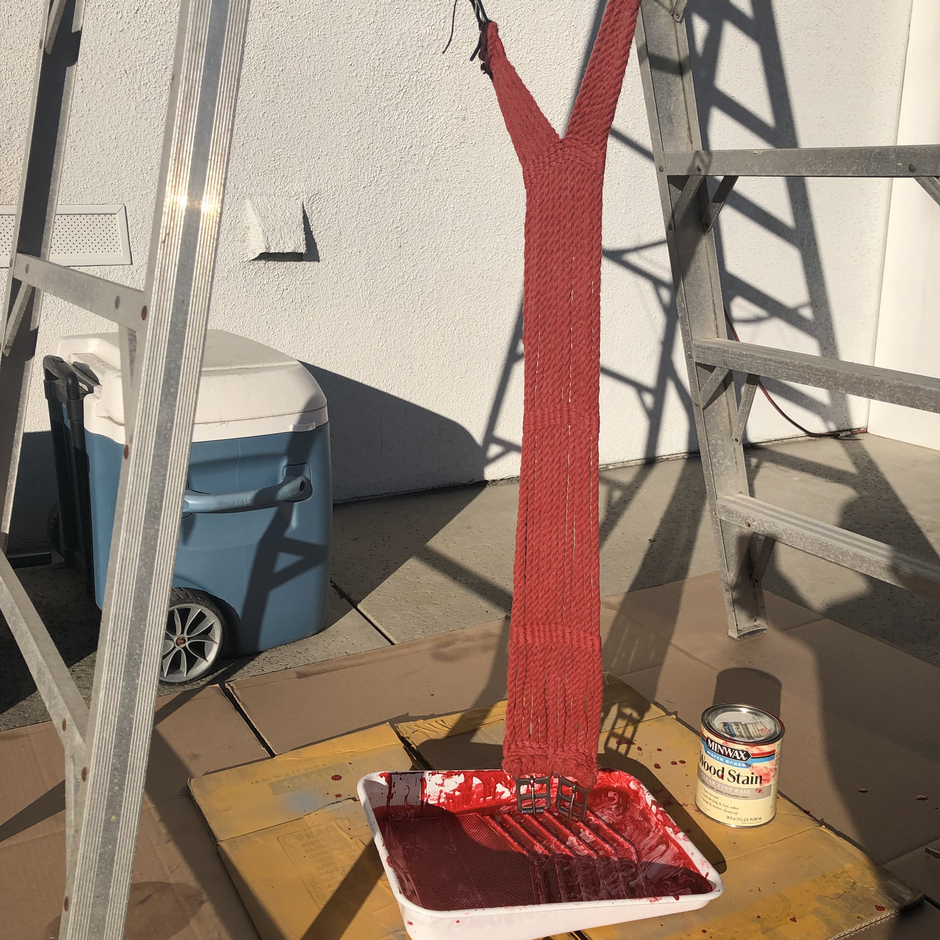 Finally back at it. Dyed my Mohair girth belt. I used MinWax Red mix Sedona red. This is soaked onceonce. Squeezed out the excess and blotted with rags. I will see when it dries if I need to do it again. I lost a picture when it has dried.
