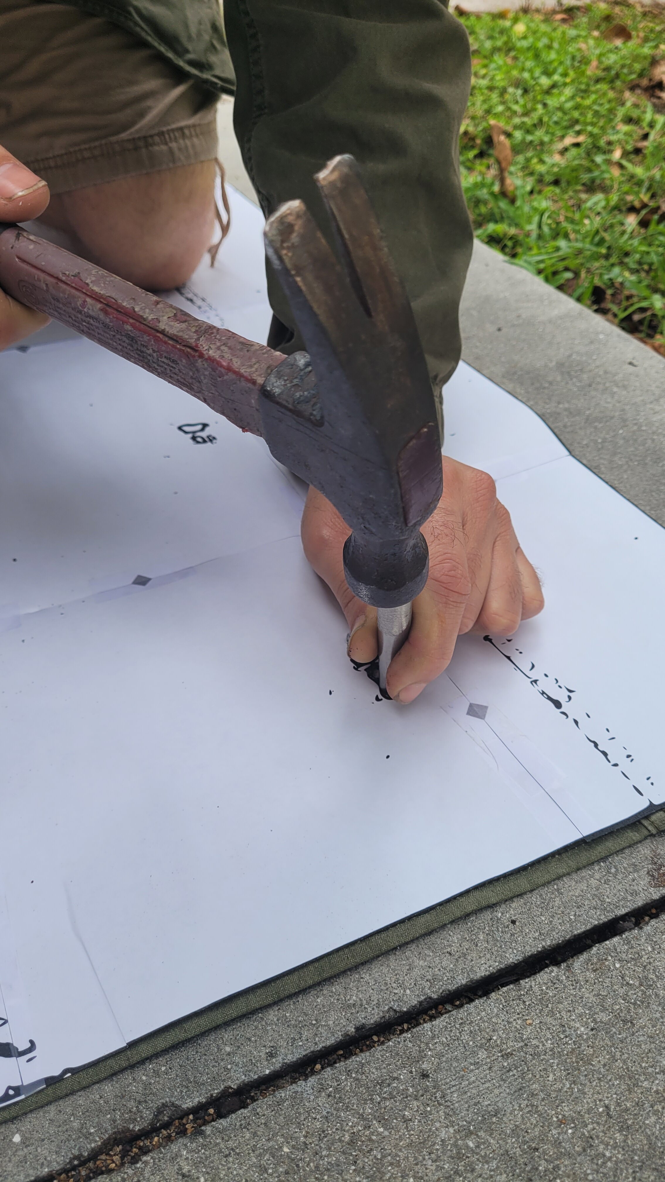 Following the printable template I made, I used a short metal rod about half inch in diameter at an angle and hit it with a hammer successfully smashing the paper and fabric into the concrete.