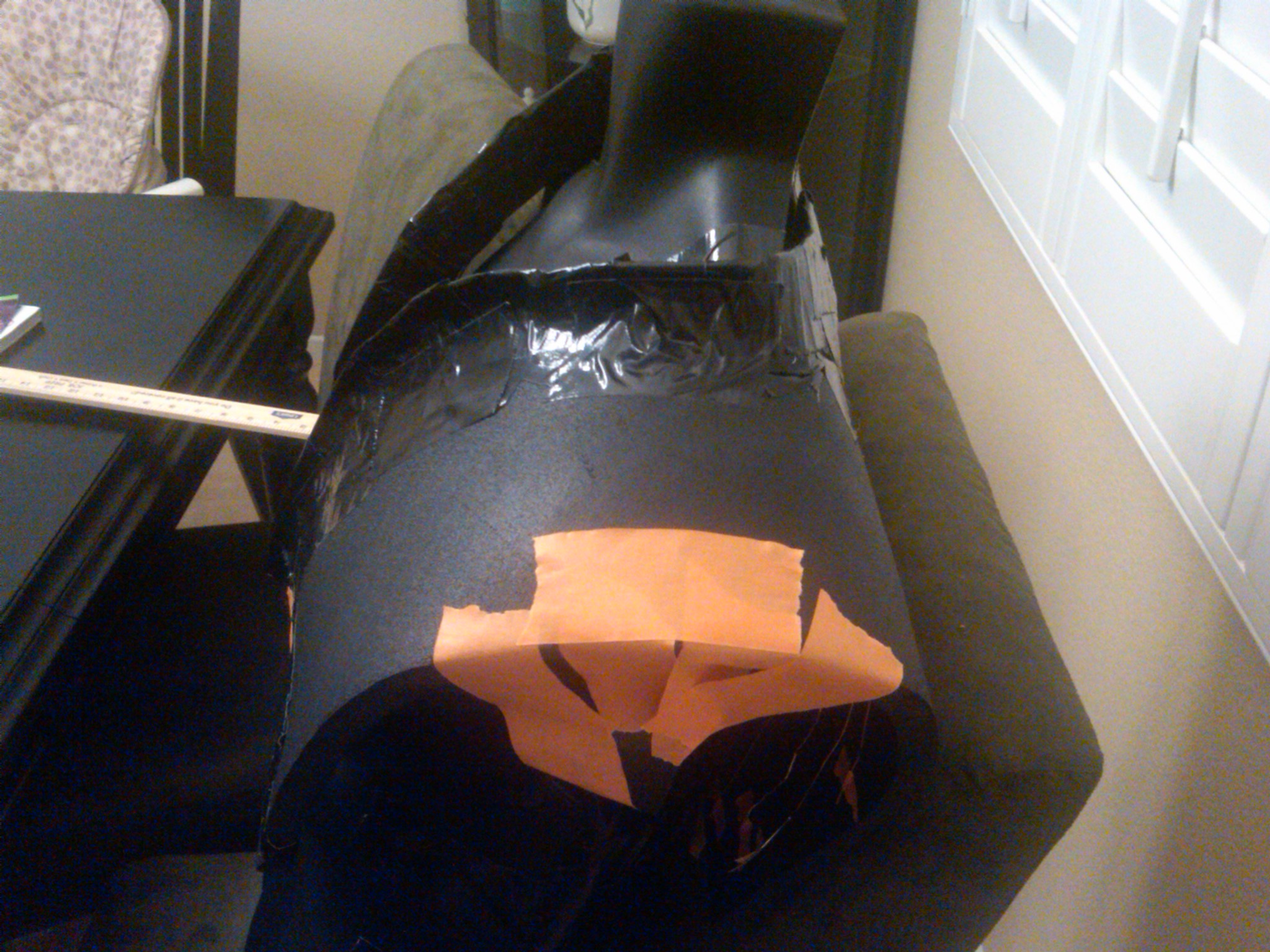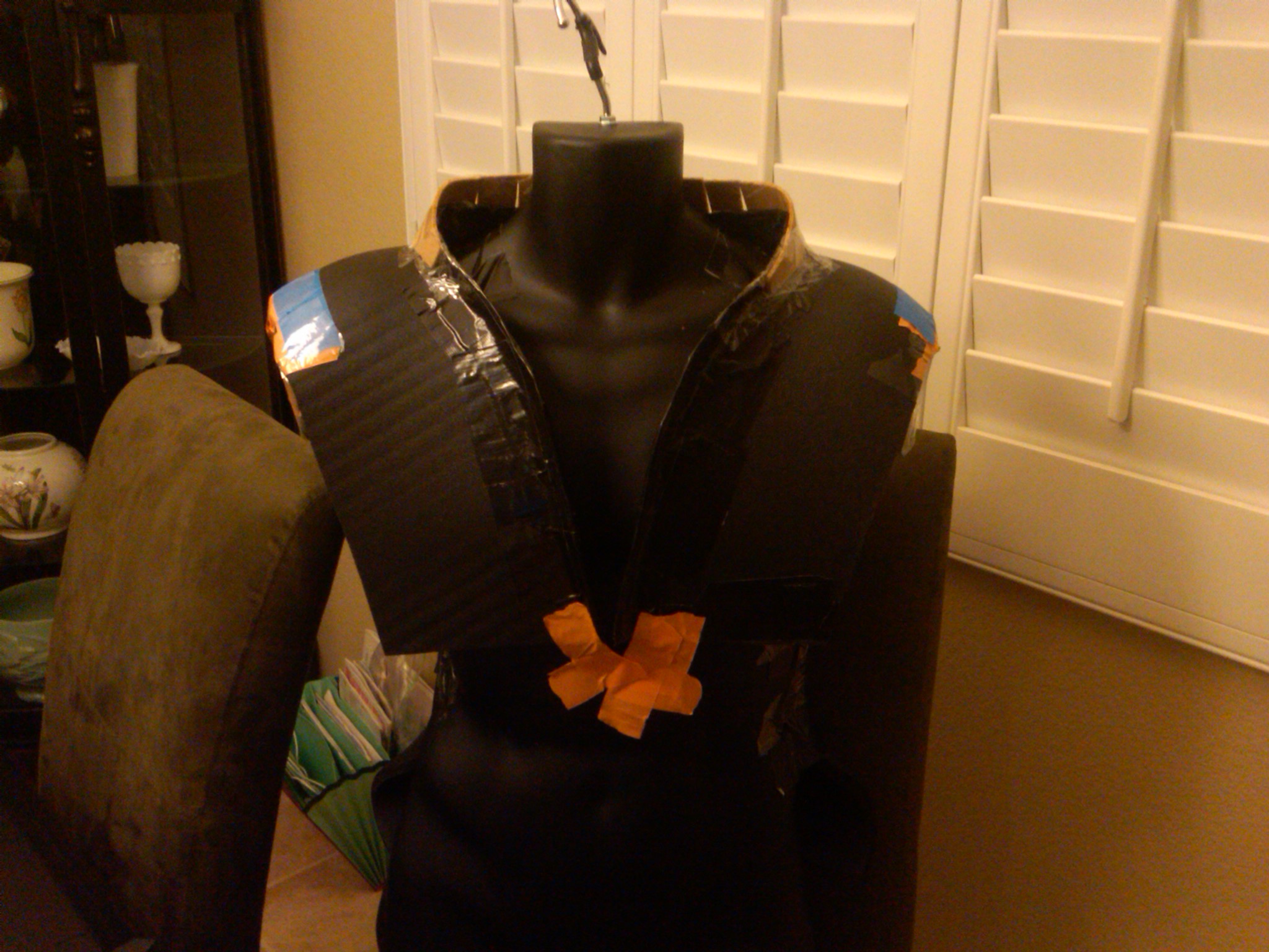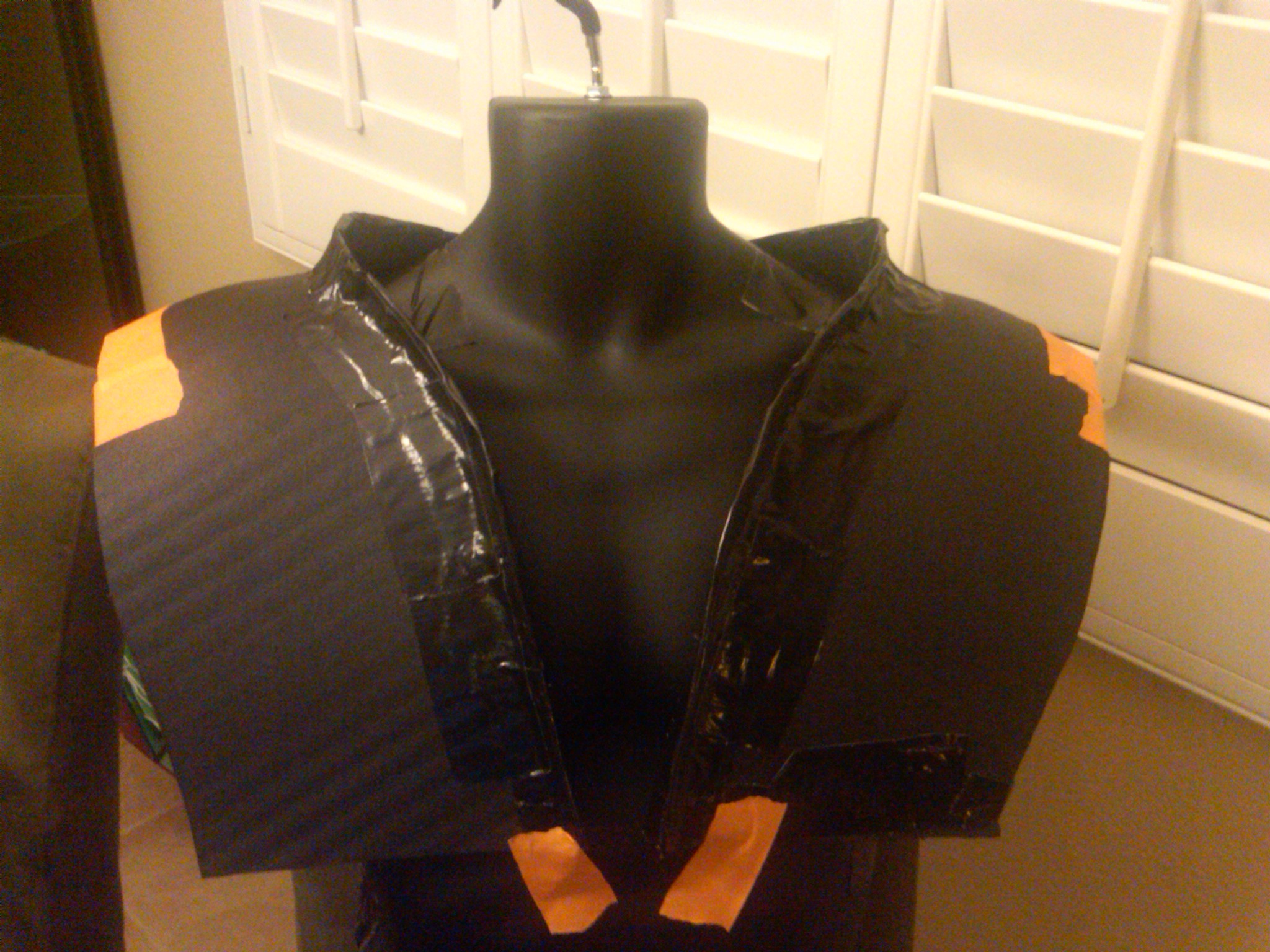 Hey guys- In my very little spare time i was inspired to attempt my first armor attempt ever. Although I have never played the game, I am currently finishing the book. Using an abdominal crunch mat I pulled from my gym, I skeched and shaped the cast over a mannequin. Next I used some cork from Joannes fabrics, black duck tape (because im anal and wanted it to match the padding) to shape the collar. Next, I will have a buddy of mine fiberglass. I wanted the chest armor to be a bit "beefier" than some of the images ive seen. In the first photo youll notice that i've actually trimmed the sides to be a bit closer to the game images although I have brought the pectoral portion a bit lower. Let me know what you guys think so far. Ill keep ya posted!