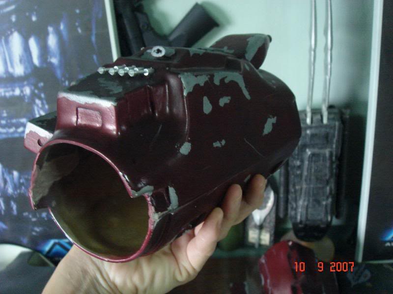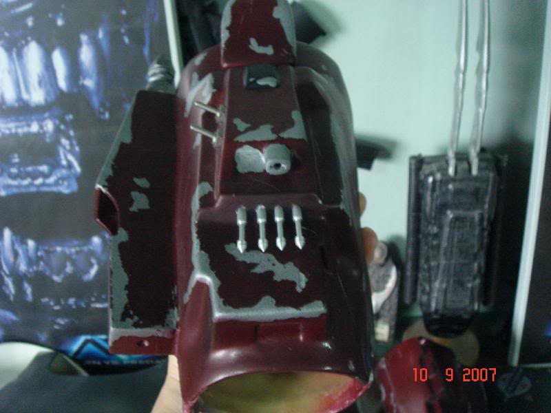 Speaking of finishing, I went ahead and added some finishing touches to a few pieces that needed them. I painted and installed the aluminum darts into the knee pads, painted the tops of the metal collar studs that needed it, and finished altering the flamethrower a little on the left gauntlet.