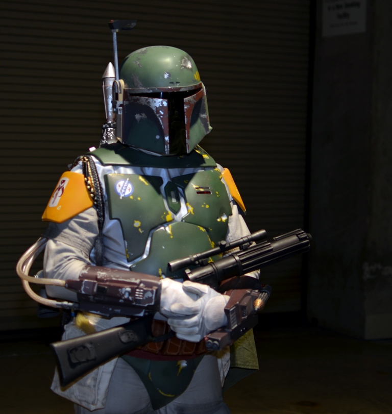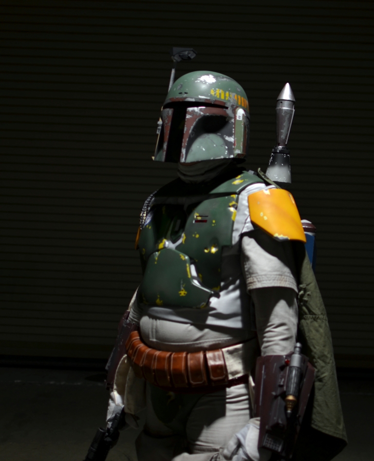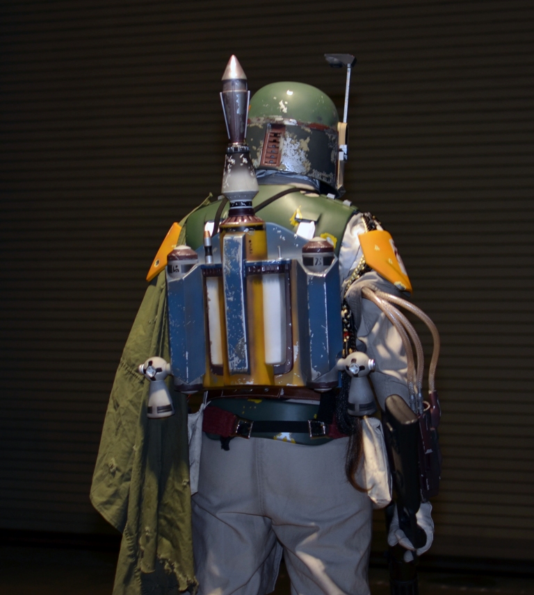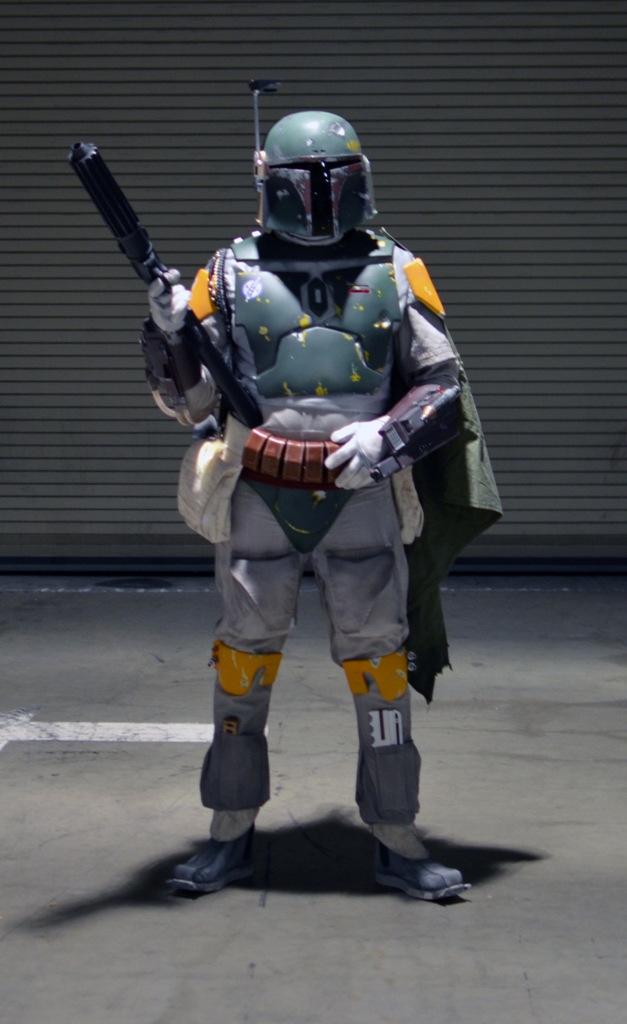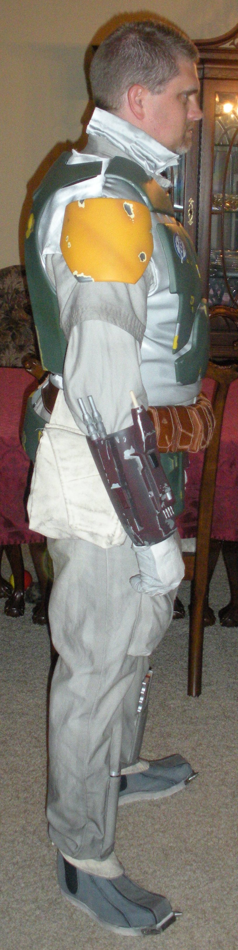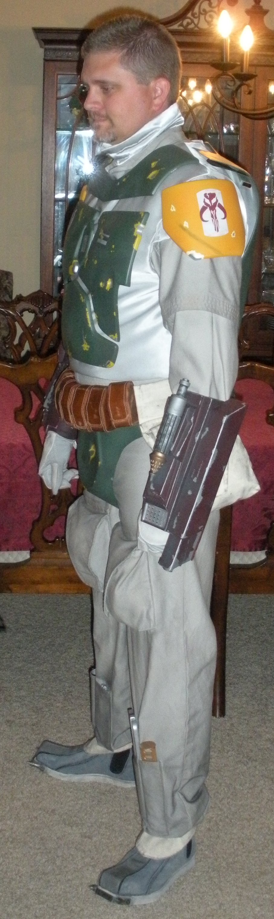 Well it has been a slow process but it is finally nearing completion. I did a test fitting yesterday to see how things would look assembled and on my person. Now grant it all armor pieces are being held on in the pictures below with some duct tape and did begin to shift a little when I had my wife take some quick pics sorry for some of the blurry ones!!! Over all I am very pleased on how it looks your thoughts are always welcome!!!. When it comes time to mount everything I plan to blot it on through the vest as i don't want to run into any issues with pieces falling off. Pieces that I left off were the cape and the braids and the knees as I did not want to try and hold those up using duct tape I also still need to add the hoses for the gaunts and I still need to dye my girth belt. As for the blaster, helmet and jet pack, well sidewinder sent that out today and I should be receiving it in a week or two, for the jet pack I will be doing some trade work with FettSeven to get one of his packs, and for the lid I am am waiting on a replacement from FP. I will put up a list later of all parts and maker any way onto the pics and let me know what you think so far as I value your guys opinion.